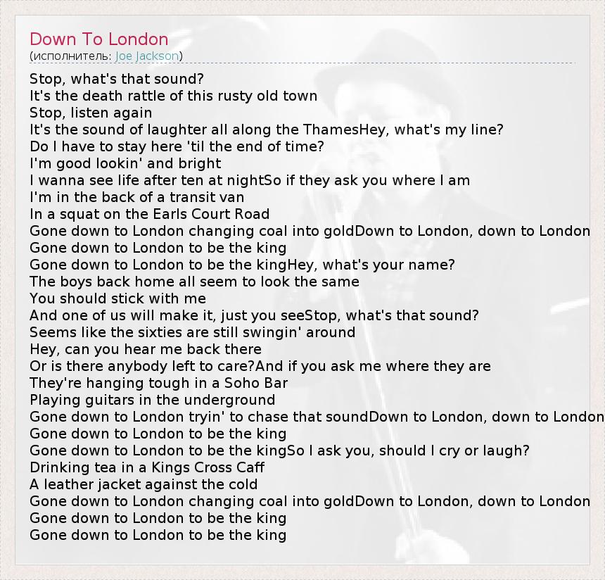 Stop, what's that sound? It's the death rattle of this rusty old town Stop, listen again It's the sound of laughter all along the ThamesHey, what's my line? Do I have to stay here 'til the end of time? I'm good lookin' and bright I wanna see life after ten at nightSo if they ask you where I am I'm in the back of a transit van In a squat on the Earls Court Road Gone down to London changing coal into goldDown to London, down to London Gone down to London to be the king Gone down to London to be the kingHey, what's your name? The boys back home all seem to look the same You should stick with me And one of us will make it, just you seeStop, what's that sound? Seems like the sixties are still swingin' around Hey, can you hear me back there Or is there anybody left to care?And if you ask me where they are They're hanging tough in a Soho Bar Playing guitars in the underground Gone down to London tryin' to chase that soundDown to London, down to London Gone down to London to be the king Gone down to London to be the kingSo I ask you, should I cry or laugh? Drinking tea in a Kings Cross Caff A leather jacket against the cold Gone down to London changing coal into goldDown to London, down to London Gone down to London to be the king Gone down to London to be the king