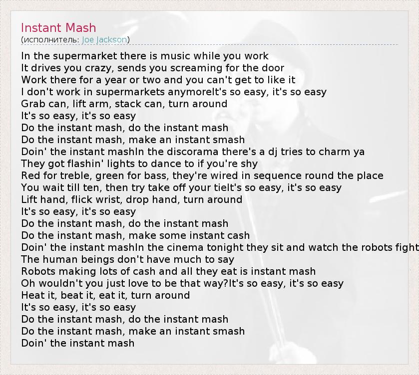 In the supermarket there is music while you work It drives you crazy, sends you screaming for the door Work there for a year or two and you can't get to like it I don't work in supermarkets anymoreIt's so easy, it's so easy Grab can, lift arm, stack can, turn around It's so easy, it's so easy Do the instant mash, do the instant mash Do the instant mash, make an instant smash Doin' the instant mashIn the discorama there's a dj tries to charm ya They got flashin' lights to dance to if you're shy Red for treble, green for bass, they're wired in sequence round the place You wait till ten, then try take off your tieIt's so easy, it's so easy Lift hand, flick wrist, drop hand, turn around It's so easy, it's so easy Do the instant mash, do the instant mash Do the instant mash, make some instant cash Doin' the instant mashIn the cinema tonight they sit and watch the robots fight The human beings don't have much to say Robots making lots of cash and all they eat is instant mash Oh wouldn't you just love to be that way?It's so easy, it's so easy Heat it, beat it, eat it, turn around It's so easy, it's so easy Do the instant mash, do the instant mash Do the instant mash, make an instant smash Doin' the instant mash