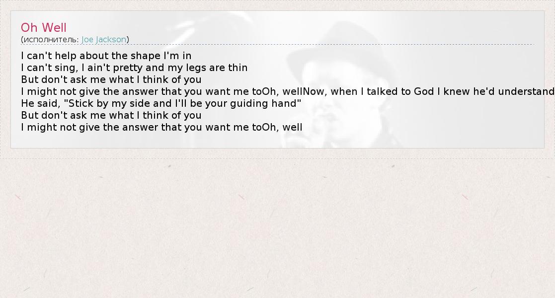 Это интересно:Английский музыкант, поэт-песенник и исполнитель Джо Джексон (наст. имя - David Ian Jackson) родился в 1954 году в Стаффордшире, Великобритания. Родители, романтическое знакомство которых состоялось в бытность его отца матросом, а матери - официанткой в пабе на берегу, вскоре перевезли своего сына в Портсмут. Астматик, Джексон рос слабым и болезненным ребенком, далеким от спорта и все свое время... продолжение
