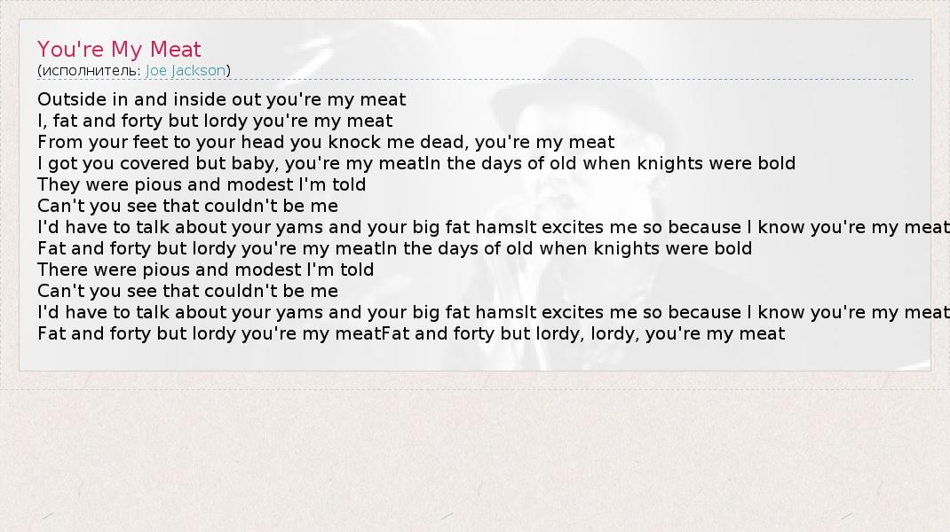 Outside in and inside out you're my meat I, fat and forty but lordy you're my meat From your feet to your head you knock me dead, you're my meat I got you covered but baby, you're my meatIn the days of old when knights were bold They were pious and modest I'm told Can't you see that couldn't be me I'd have to talk about your yams and your big fat hamsIt excites me so because I know you're my meat Fat and forty but lordy you're my meatIn the days of old when knights were bold There were pious and modest I'm told Can't you see that couldn't be me I'd have to talk about your yams and your big fat hamsIt excites me so because I know you're my meat Fat and forty but lordy you're my meatFat and forty but lordy, lordy, you're my meat