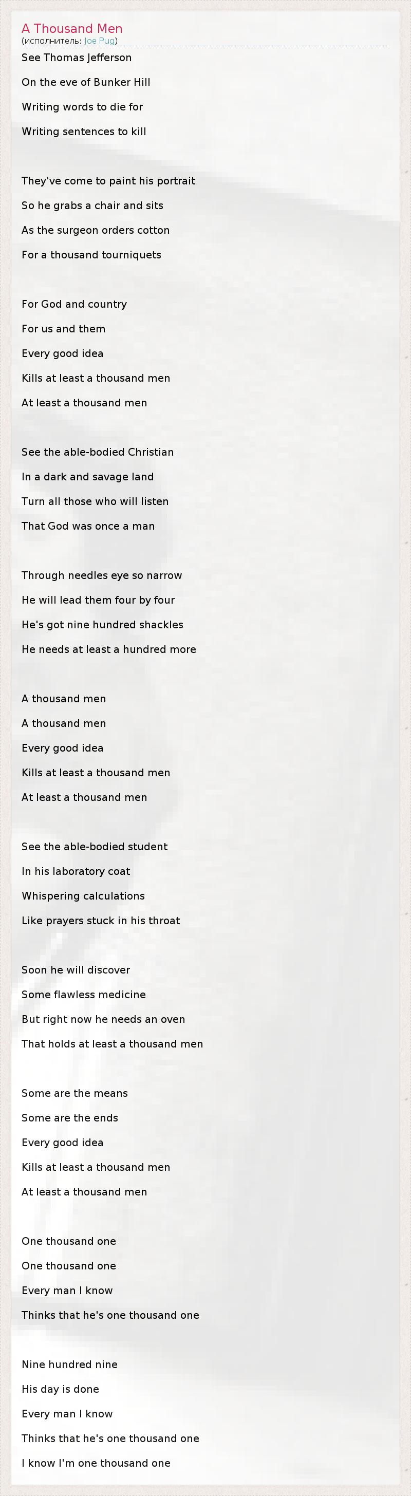 See Thomas Jefferson On the eve of Bunker Hill Writing words to die for Writing sentences to kill They've come to paint his portrait So he grabs a chair and sits As the surgeon orders cotton For a thousand tourniquets For God and country For us and them Every good idea Kills at least a thousand men At least a thousand men See the able-bodied Christian In a dark and savage land Turn all those who will listen That God was once a man Through needles eye so narrow He will lead them four by four He's got nine hundred shackles He needs at least a hundred more A thousand men A thousand men Every good idea Kills at least a thousand men At least a thousand men See the able-bodied student In his laboratory coat Whispering calculations Like prayers stuck in his throat Soon he will discover Some flawless medicine But right now he needs an oven That holds at least a thousand men Some are the means Some are the ends Every good idea Kills at least a thousand men At least a thousand men One thousand one One thousand one Every man I know Thinks that he's one thousand one Nine hundred nine His day is done Every man I know Thinks that he's one thousand one I know I'm one thousand one