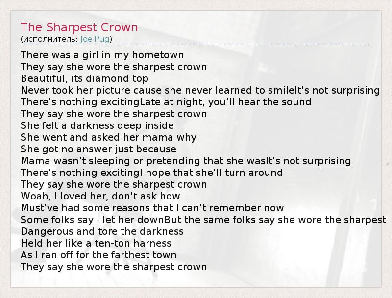 There was a girl in my hometown They say she wore the sharpest crown Beautiful, its diamond top Never took her picture cause she never learned to smileIt's not surprising There's nothing excitingLate at night, you'll hear the sound They say she wore the sharpest crown She felt a darkness deep inside She went and asked her mama why She got no answer just because Mama wasn't sleeping or pretending that she wasIt's not surprising There's nothing excitingI hope that she'll turn around They say she wore the sharpest crown Woah, I loved her, don't ask how Must've had some reasons that I can't remember now Some folks say I let her downBut the same folks say she wore the sharpest Dangerous and tore the darkness Held her like a ten-ton harness As I ran off for the farthest town They say she wore the sharpest crown