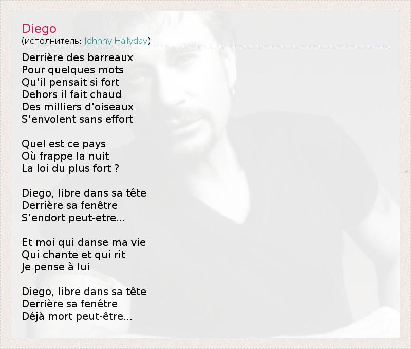Derrière des barreaux Pour quelques mots Qu'il pensait si fort Dehors il fait chaud Des milliers d'oiseaux S'envolent sans effort Quel est ce pays Où frappe la nuit La loi du plus fort ? Diego, libre dans sa tête Derrière sa fenêtre S'endort peut-etre... Et moi qui danse ma vie Qui chante et qui rit Je pense à lui Diego, libre dans sa tête Derrière sa fenêtre Déjà mort peut-être...