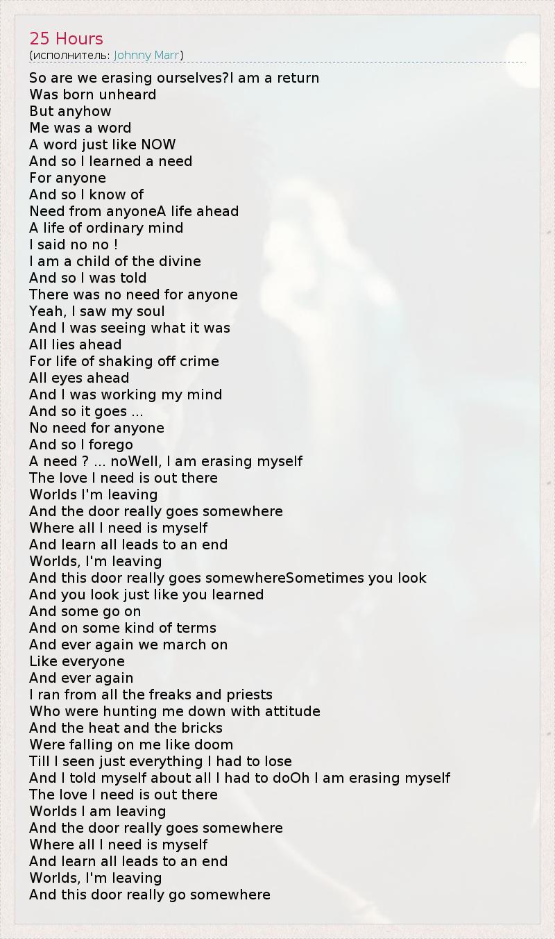So are we erasing ourselves?I am a return Was born unheard But anyhow Me was a word A word just like NOW And so I learned a need For anyone And so I know of Need from anyoneA life ahead A life of ordinary mind I said no no ! I am a child of the divine And so I was told There was no need for anyone Yeah, I saw my soul And I was seeing what it was All lies ahead For life of shaking off crime All eyes ahead And I was working my mind And so it goes ... No need for anyone And so I forego A need ? ... noWell, I am erasing myself The love I need is out there Worlds I'm leaving And the door really goes somewhere Where all I need is myself And learn all leads to an end Worlds, I'm leaving And this door really goes somewhereSometimes you look And you look just like you learned And some go on And on some kind of terms And ever again we march on Like everyone And ever again I ran from all the freaks and priests Who were hunting me down with attitude And the heat and the bricks Were falling on me like doom Till I seen just everything I had to lose And I told myself about all I had to doOh I am erasing myself The love I need is out there Worlds I am leaving And the door really goes somewhere Where all I need is myself And learn all leads to an end Worlds, I'm leaving And this door really go somewhere