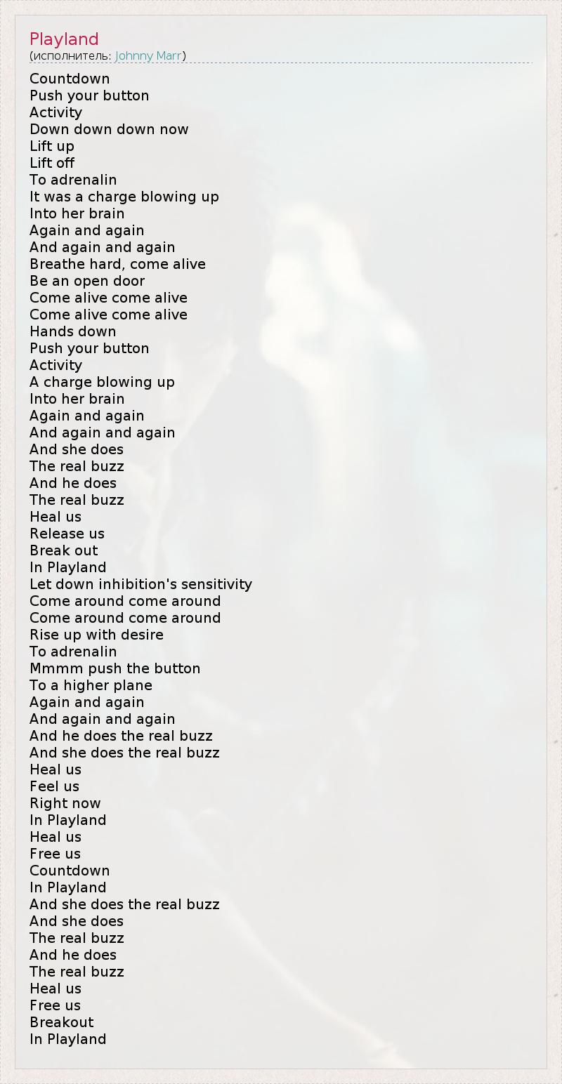 Countdown Push your button Activity Down down down now Lift up Lift off To adrenalin It was a charge blowing up Into her brain Again and again And again and again Breathe hard, come alive Be an open door Come alive come alive Come alive come alive Hands down Push your button Activity A charge blowing up Into her brain Again and again And again and again And she does The real buzz And he does The real buzz Heal us Release us Break out In Playland Let down inhibition's sensitivity Come around come around Come around come around Rise up with desire To adrenalin Mmmm push the button To a higher plane Again and again And again and again And he does the real buzz And she does the real buzz Heal us Feel us Right now In Playland Heal us Free us Countdown In Playland And she does the real buzz And she does The real buzz And he does The real buzz Heal us Free us Breakout In Playland