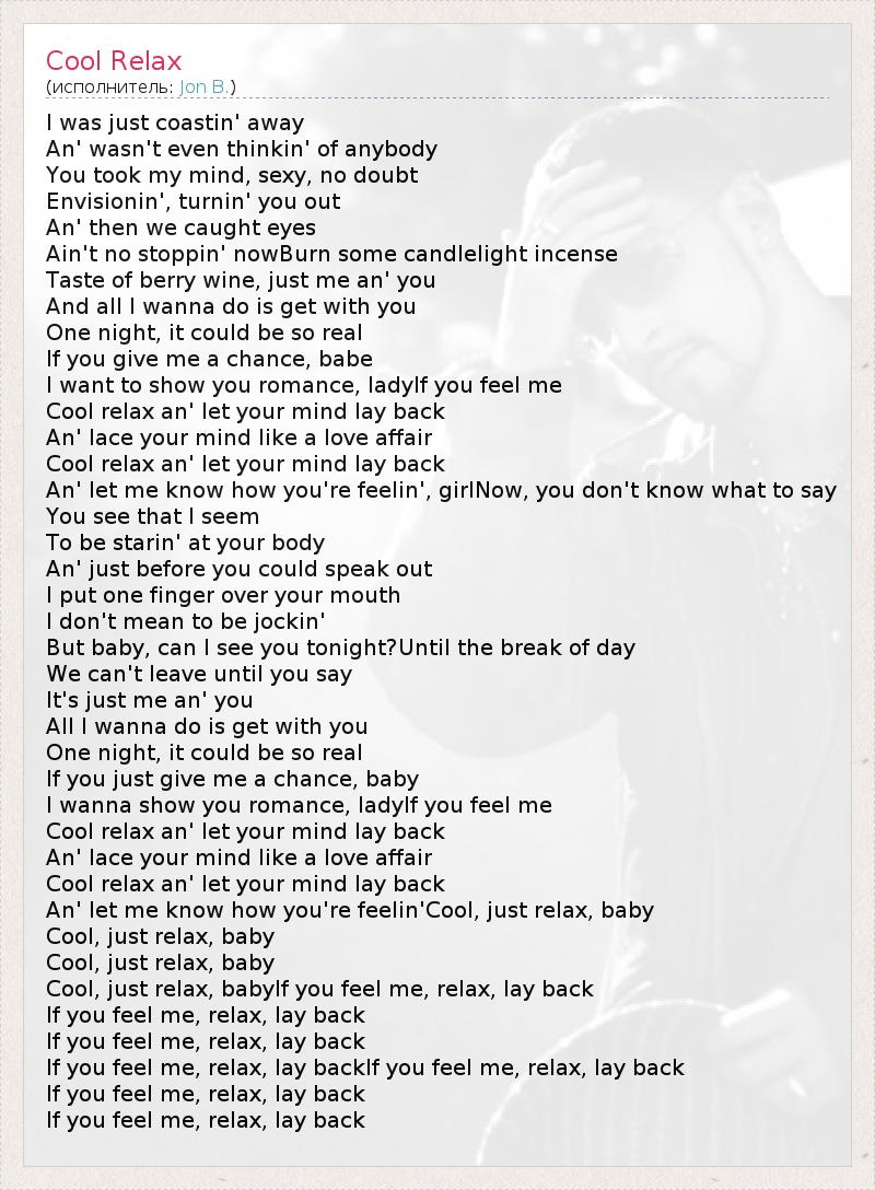 I was just coastin' away An' wasn't even thinkin' of anybody You took my mind, sexy, no doubt Envisionin', turnin' you out An' then we caught eyes Ain't no stoppin' nowBurn some candlelight incense Taste of berry wine, just me an' you And all I wanna do is get with you One night, it could be so real If you give me a chance, babe I want to show you romance, ladyIf you feel me Cool relax an' let your mind lay back An' lace your mind like a love affair Cool relax an' let your mind lay back An' let me know how you're feelin', girlNow, you don't know what to say You see that I seem To be starin' at your body An' just before you could speak out I put one finger over your mouth I don't mean to be jockin' But baby, can I see you tonight?Until the break of day We can't leave until you say It's just me an' you All I wanna do is get with you One night, it could be so real If you just give me a chance, baby I wanna show you romance, ladyIf you feel me Cool relax an' let your mind lay back An' lace your mind like a love affair Cool relax an' let your mind lay back An' let me know how you're feelin'Cool, just relax, baby Cool, just relax, baby Cool, just relax, baby Cool, just relax, babyIf you feel me, relax, lay back If you feel me, relax, lay back If you feel me, relax, lay back If you feel me, relax, lay backIf you feel me, relax, lay back If you feel me, relax, lay back If you feel me, relax, lay back