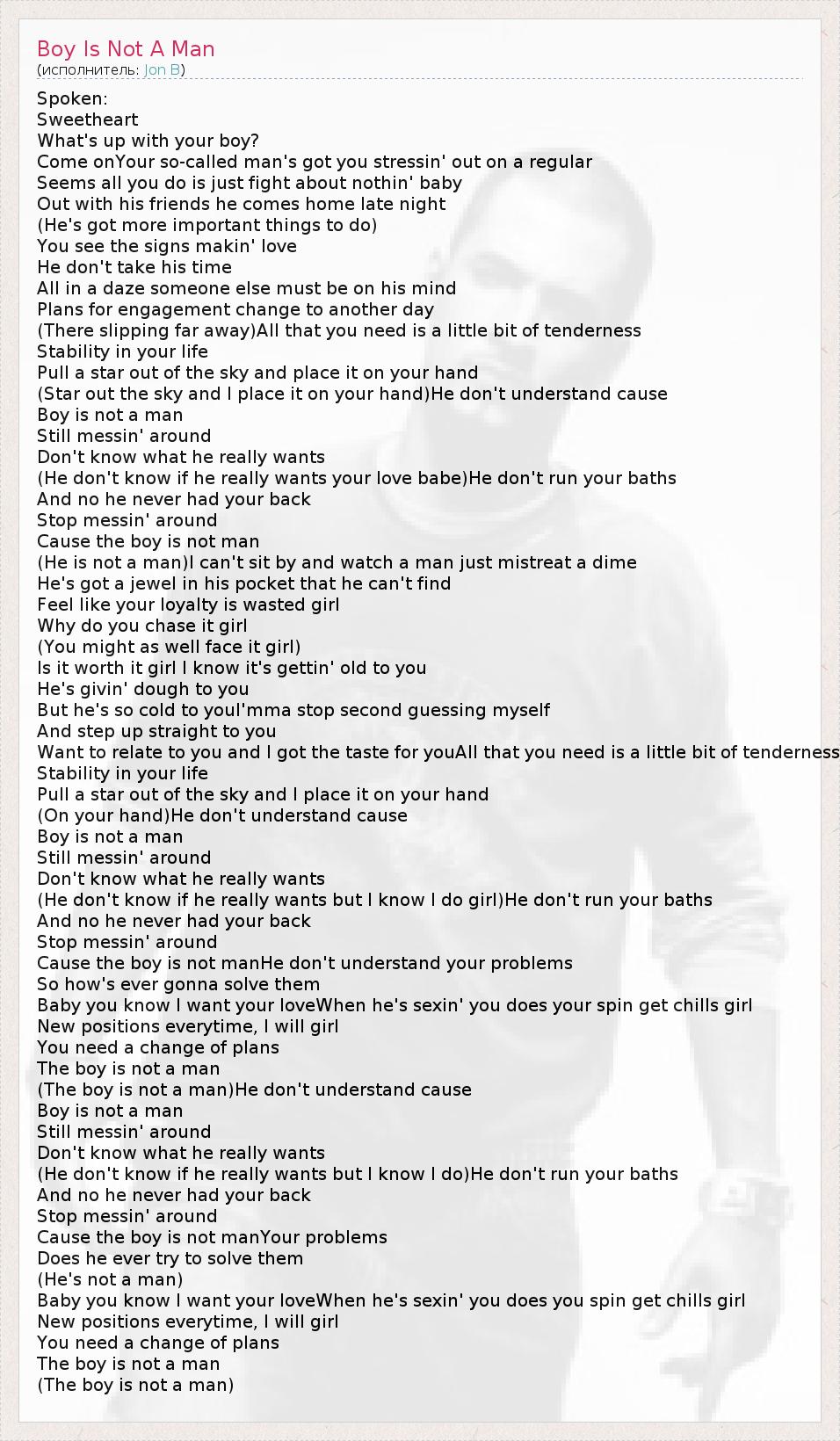 Spoken: Sweetheart What's up with your boy? Come onYour so-called man's got you stressin' out on a regular Seems all you do is just fight about nothin' baby Out with his friends he comes home late night (He's got more important things to do) You see the signs makin' love He don't take his time All in a daze someone else must be on his mind Plans for engagement change to another day (There slipping far away)All that you need is a little bit of tenderness Stability in your life Pull a star out of the sky and place it on your hand (Star out the sky and I place it on your hand)He don't understand cause Boy is not a man Still messin' around Don't know what he really wants (He don't know if he really wants your love babe)He don't run your baths And no he never had your back Stop messin' around Cause the boy is not man (He is not a man)I can't sit by and watch a man just mistreat a dime He's got a jewel in his pocket that he can't find Feel like your loyalty is wasted girl Why do you chase it girl (You might as well face it girl) Is it worth it girl I know it's gettin' old to you He's givin' dough to you But he's so cold to youI'mma stop second guessing myself And step up straight to you Want to relate to you and I got the taste for youAll that you need is a little bit of tenderness Stability in your life Pull a star out of the sky and I place it on your hand (On your hand)He don't understand cause Boy is not a man Still messin' around Don't know what he really wants (He don't know if he really wants but I know I do girl)He don't run your baths And no he never had your back Stop messin' around Cause the boy is not manHe don't understand your problems So how's ever gonna solve them Baby you know I want your loveWhen he's sexin' you does your spin get chills girl New positions everytime, I will girl You need a change of plans The boy is not a man (The boy is not a man)He don't understand cause Boy is not a man Still messin' around Don't know what he really wants (He don't know if he really wants but I know I do)He don't run your baths And no he never had your back Stop messin' around Cause the boy is not manYour problems Does he ever try to solve them (He's not a man) Baby you know I want your loveWhen he's sexin' you does you spin get chills girl New positions everytime, I will girl You need a change of plans The boy is not a man (The boy is not a man)