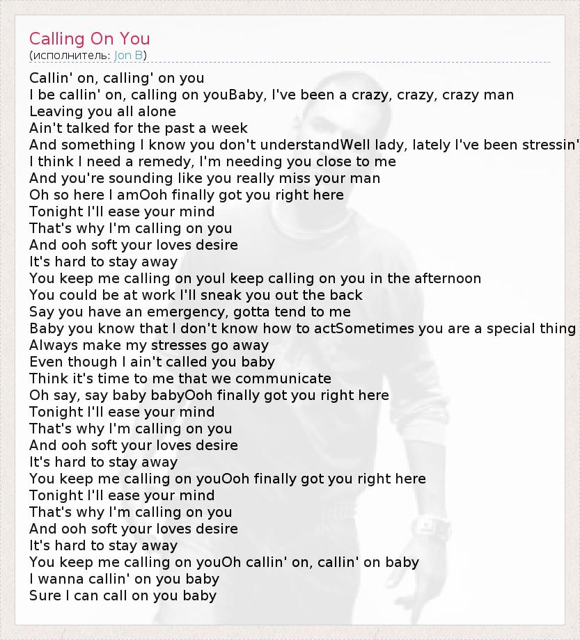 Callin' on, calling' on you I be callin' on, calling on youBaby, I've been a crazy, crazy, crazy man Leaving you all alone Ain't talked for the past a week And something I know you don't understandWell lady, lately I've been stressin' I think I need a remedy, I'm needing you close to me And you're sounding like you really miss your man Oh so here I amOoh finally got you right here Tonight I'll ease your mind That's why I'm calling on you And ooh soft your loves desire It's hard to stay away You keep me calling on youI keep calling on you in the afternoon You could be at work I'll sneak you out the back Say you have an emergency, gotta tend to me Baby you know that I don't know how to actSometimes you are a special thing Always make my stresses go away Even though I ain't called you baby Think it's time to me that we communicate Oh say, say baby babyOoh finally got you right here Tonight I'll ease your mind That's why I'm calling on you And ooh soft your loves desire It's hard to stay away You keep me calling on youOoh finally got you right here Tonight I'll ease your mind That's why I'm calling on you And ooh soft your loves desire It's hard to stay away You keep me calling on youOh callin' on, callin' on baby I wanna callin' on you baby Sure I can call on you baby