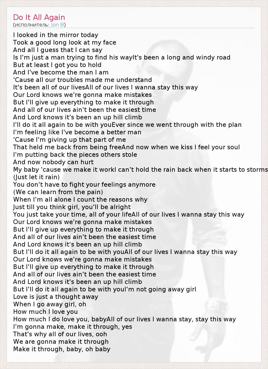 I looked in the mirror today Took a good long look at my face And all I guess that I can say Is I'm just a man trying to find his wayIt's been a long and windy road But at least I got you to hold And I've become the man I am 'Cause all our troubles made me understand It's been all of our livesAll of our lives I wanna stay this way Our Lord knows we're gonna make mistakes But I'll give up everything to make it through And all of our lives ain't been the easiest time And Lord knows it's been an up hill climb I'll do it all again to be with youEver since we went through with the plan I'm feeling like I've become a better man 'Cause I'm giving up that part of me That held me back from being freeAnd now when we kiss I feel your soul I'm putting back the pieces others stole And now nobody can hurt My baby 'cause we make it workI can't hold the rain back when it starts to storms (Just let it rain) You don't have to fight your feelings anymore (We can learn from the pain) When I'm all alone I count the reasons why Just till you think girl, you'll be alright You just take your time, all of your lifeAll of our lives I wanna stay this way Our Lord knows we're gonna make mistakes But I'll give up everything to make it through And all of our lives ain't been the easiest time And Lord knows it's been an up hill climb But I'll do it all again to be with youAll of our lives I wanna stay this way Our Lord knows we're gonna make mistakes But I'll give up everything to make it through And all of our lives ain't been the easiest time And Lord knows it's been an up hill climb But I'll do it all again to be with youI'm not going away girl Love is just a thought away When I go away girl, oh How much I love you How much I do love you, babyAll of our lives I wanna stay, stay this way I'm gonna make, make it through, yes That's why all of our lives, ooh We are gonna make it through Make it through, baby, oh baby