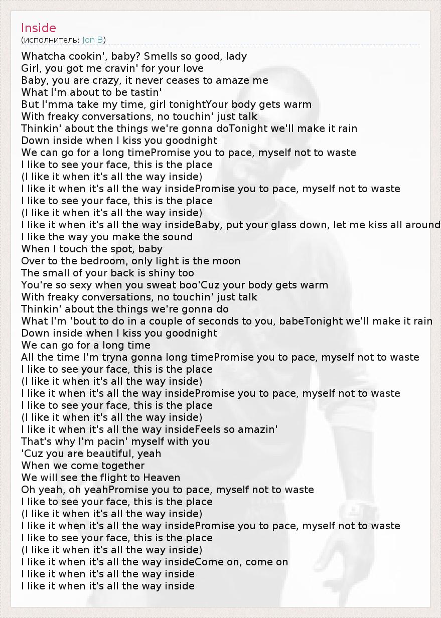 Whatcha cookin', baby? Smells so good, lady Girl, you got me cravin' for your love Baby, you are crazy, it never ceases to amaze me What I'm about to be tastin' But I'mma take my time, girl tonightYour body gets warm With freaky conversations, no touchin' just talk Thinkin' about the things we're gonna doTonight we'll make it rain Down inside when I kiss you goodnight We can go for a long timePromise you to pace, myself not to waste I like to see your face, this is the place (I like it when it's all the way inside) I like it when it's all the way insidePromise you to pace, myself not to waste I like to see your face, this is the place (I like it when it's all the way inside) I like it when it's all the way insideBaby, put your glass down, let me kiss all around I like the way you make the sound When I touch the spot, baby Over to the bedroom, only light is the moon The small of your back is shiny too You're so sexy when you sweat boo'Cuz your body gets warm With freaky conversations, no touchin' just talk Thinkin' about the things we're gonna do What I'm 'bout to do in a couple of seconds to you, babeTonight we'll make it rain Down inside when I kiss you goodnight We can go for a long time All the time I'm tryna gonna long timePromise you to pace, myself not to waste I like to see your face, this is the place (I like it when it's all the way inside) I like it when it's all the way insidePromise you to pace, myself not to waste I like to see your face, this is the place (I like it when it's all the way inside) I like it when it's all the way insideFeels so amazin' That's why I'm pacin' myself with you 'Cuz you are beautiful, yeah When we come together We will see the flight to Heaven Oh yeah, oh yeahPromise you to pace, myself not to waste I like to see your face, this is the place (I like it when it's all the way inside) I like it when it's all the way insidePromise you to pace, myself not to waste I like to see your face, this is the place (I like it when it's all the way inside) I like it when it's all the way insideCome on, come on I like it when it's all the way inside I like it when it's all the way inside