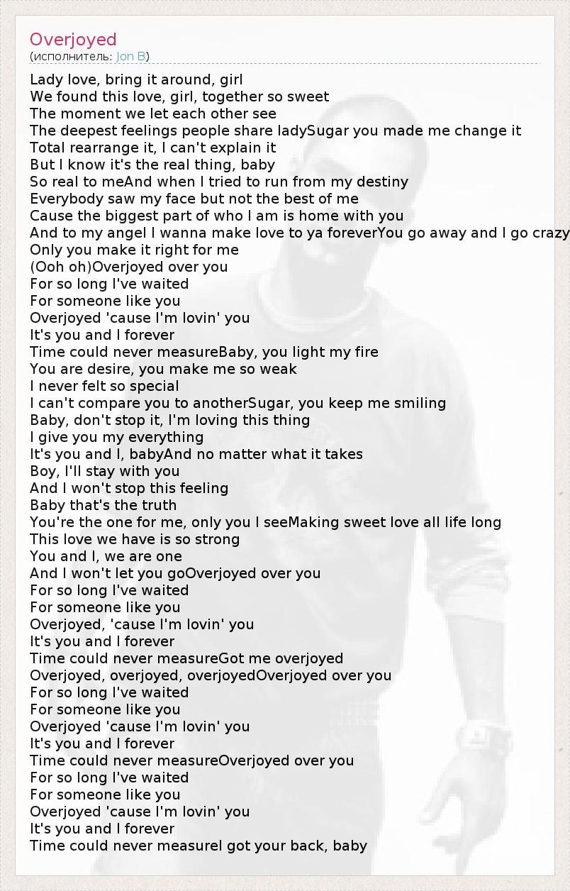 Lady love, bring it around, girl We found this love, girl, together so sweet The moment we let each other see The deepest feelings people share ladySugar you made me change it Total rearrange it, I can't explain it But I know it's the real thing, baby So real to meAnd when I tried to run from my destiny Everybody saw my face but not the best of me Cause the biggest part of who I am is home with you And to my angel I wanna make love to ya foreverYou go away and I go crazy Only you make it right for me (Ooh oh)Overjoyed over you For so long I've waited For someone like you Overjoyed 'cause I'm lovin' you It's you and I forever Time could never measureBaby, you light my fire You are desire, you make me so weak I never felt so special I can't compare you to anotherSugar, you keep me smiling Baby, don't stop it, I'm loving this thing I give you my everything It's you and I, babyAnd no matter what it takes Boy, I'll stay with you And I won't stop this feeling Baby that's the truth You're the one for me, only you I seeMaking sweet love all life long This love we have is so strong You and I, we are one And I won't let you goOverjoyed over you For so long I've waited For someone like you Overjoyed, 'cause I'm lovin' you It's you and I forever Time could never measureGot me overjoyed Overjoyed, overjoyed, overjoyedOverjoyed over you For so long I've waited For someone like you Overjoyed 'cause I'm lovin' you It's you and I forever Time could never measureOverjoyed over you For so long I've waited For someone like you Overjoyed 'cause I'm lovin' you It's you and I forever Time could never measureI got your back, baby