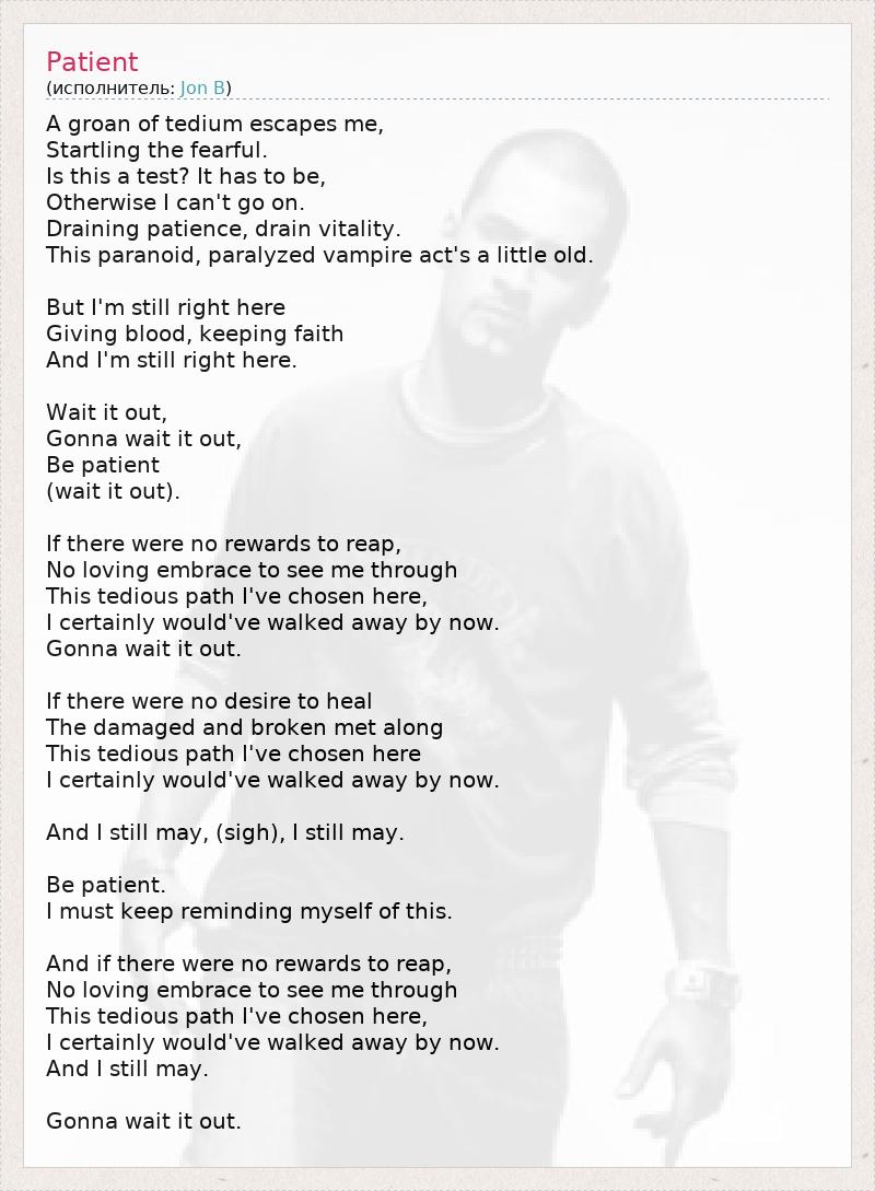 От скуки стон слетает с уст моих, Ужасая пугливых. Это испытание? Должно быть так, Иначе я не могу продолжать. Я теряю терпение, я лишаюсь жизненных сил. Этот застывший безумный вампирский ритуал немного устарел. Но я до сих пор здесь, Отдаю свою кровь и храню веру. Я до сих пор здесь. Я пережду, Я собираюсь переждать всё это. Будь терпеливым. (Пережди). Если бы меня не ждали награды, И не было бы объятий любимых, помогающих мне пережить это, Я бы, несомненно, уже сошёл С этого утомительного пути, который я выбрал. Я собираюсь переждать. Если бы не было желания исцелить Искалеченных и отчаявшихся, которых я встретил по пути, Я бы, несомненно, уже сошёл С этого утомительного пути, что я выбрал. Возможно, я еще сделаю это. (Вздох) Возможно. Будь терпеливым. Я должен напоминать себе об этом. Если бы меня не ждали награды, И не было бы объятий любимых, помогающих мне пережить это, Я бы, несомненно, уже сошёл С этого утомительного пути, который я выбрал. И, возможно, еще сделаю это. Я собираюсь переждать.