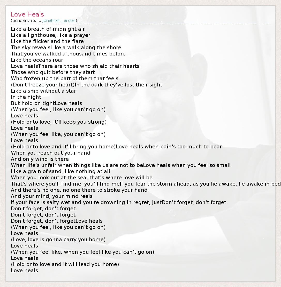 Like a breath of midnight air Like a lighthouse, like a prayer Like the flicker and the flare The sky revealsLike a walk along the shore That you've walked a thousand times before Like the oceans roar Love healsThere are those who shield their hearts Those who quit before they start Who frozen up the part of them that feels (Don't freeze your heart)In the dark they've lost their sight Like a ship without a star In the night But hold on tightLove heals (When you feel, like you can't go on) Love heals (Hold onto love, it'll keep you strong) Love heals (When you feel like, you can't go on) Love heals (Hold onto love and it'll bring you home)Love heals when pain's too much to bear When you reach out your hand And only wind is there When life's unfair when things like us are not to beLove heals when you feel so small Like a grain of sand, like nothing at all When you look out at the sea, that's where love will be That's where you'll find me, you'll find meIf you fear the storm ahead, as you lie awake, lie awake in bed And there's no one, no one there to stroke your hand And your mind, your mind reels If your face is salty wet and you're drowning in regret, justDon't forget, don't forget Don't forget, don't forget Don't forget, don't forget Don't forget, don't forgetLove heals (When you feel, like you can't go on) Love heals (Love, love is gonna carry you home) Love heals (When you feel like, when you feel like you can't go on) Love heals (Hold onto love and it will lead you home) Love heals