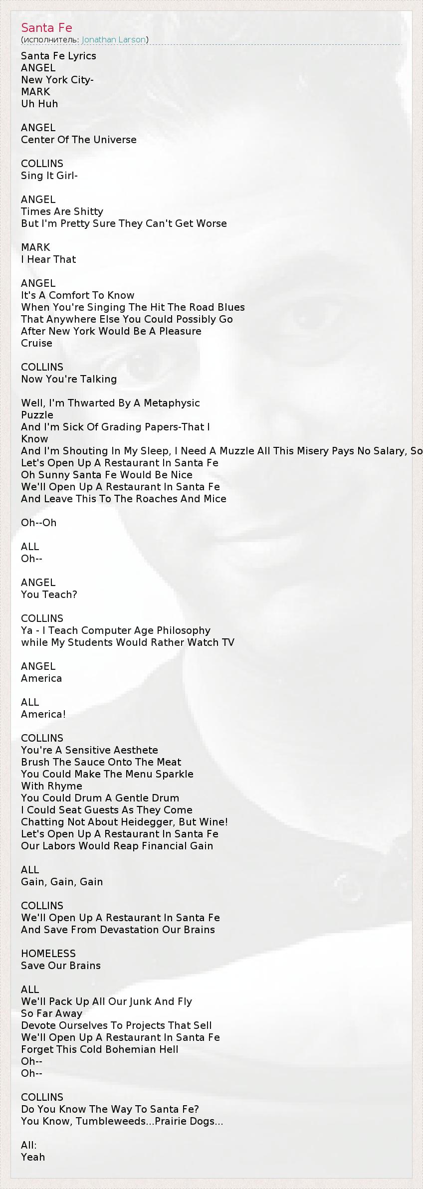 Santa Fe Lyrics ANGEL New York City- MARK Uh Huh ANGEL Center Of The Universe COLLINS Sing It Girl- ANGEL Times Are Shitty But I'm Pretty Sure They Can't Get Worse MARK I Hear That ANGEL It's A Comfort To Know When You're Singing The Hit The Road Blues That Anywhere Else You Could Possibly Go After New York Would Be A Pleasure Cruise COLLINS Now You're Talking Well, I'm Thwarted By A Metaphysic Puzzle And I'm Sick Of Grading Papers-That I Know And I'm Shouting In My Sleep, I Need A Muzzle All This Misery Pays No Salary, So Let's Open Up A Restaurant In Santa Fe Oh Sunny Santa Fe Would Be Nice We'll Open Up A Restaurant In Santa Fe And Leave This To The Roaches And Mice Oh--Oh ALL Oh-- ANGEL You Teach? COLLINS Ya - I Teach Computer Age Philosophy while My Students Would Rather Watch TV ANGEL America ALL America! COLLINS You're A Sensitive Aesthete Brush The Sauce Onto The Meat You Could Make The Menu Sparkle With Rhyme You Could Drum A Gentle Drum I Could Seat Guests As They Come Chatting Not About Heidegger, But Wine! Let's Open Up A Restaurant In Santa Fe Our Labors Would Reap Financial Gain ALL Gain, Gain, Gain COLLINS We'll Open Up A Restaurant In Santa Fe And Save From Devastation Our Brains HOMELESS Save Our Brains ALL We'll Pack Up All Our Junk And Fly So Far Away Devote Ourselves To Projects That Sell We'll Open Up A Restaurant In Santa Fe Forget This Cold Bohemian Hell Oh-- Oh-- COLLINS Do You Know The Way To Santa Fe? You Know, Tumbleweeds...Prairie Dogs... All: Yeah