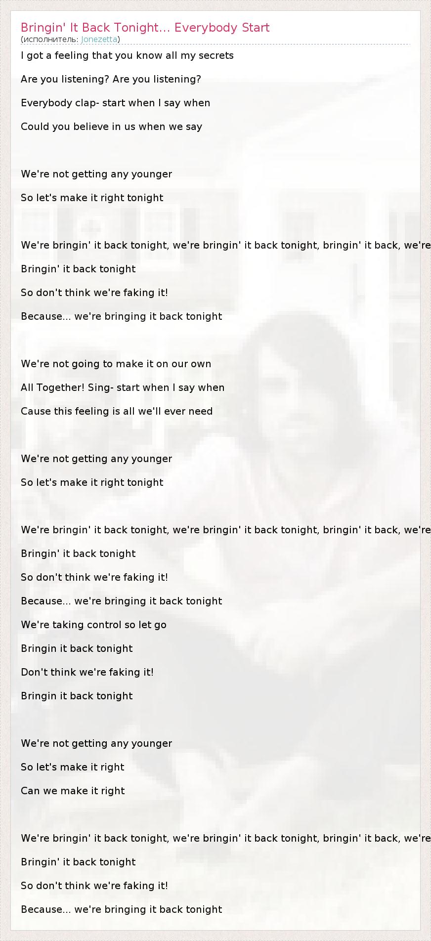 А как ты думаешь, о чем песня "Bringin' It Back Tonight... Everybody Start" ?