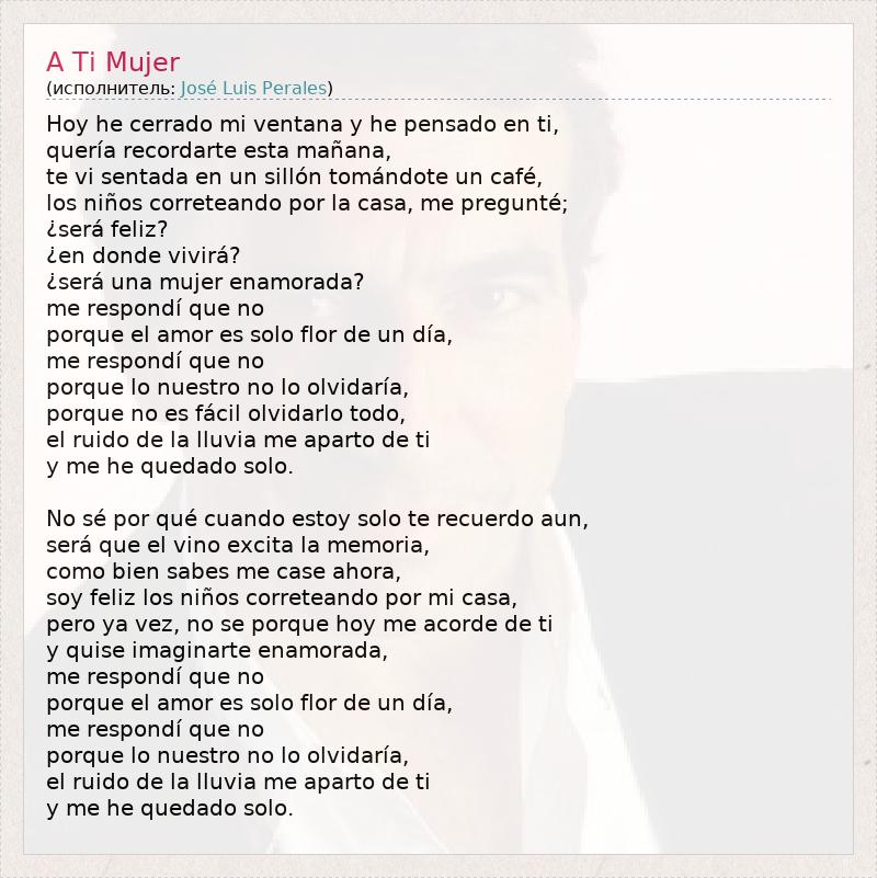 Это интересно:José Luis Perales José Luis Perales Birth name José Luis Perales Morillas Born 28 January 1945 (1945-01-28) (age 66)Castejón, Cuenca, Spain Genres BaladaRomantic music Occupations Musician, Songwriter Instruments Guitar, Vocals Years active 1972-present Labels Hispavox, Sony Music / BMG, Columbia Records Website http://www.joseluisperales.net/ (Spanish) José Luis Perales (born January 28, 1945 in Castejón, Cuenca Province) is a Spanish singer-songwriter and composer who is very popular in Spain and Latin America. He has performed some of his extensive work... продолжение