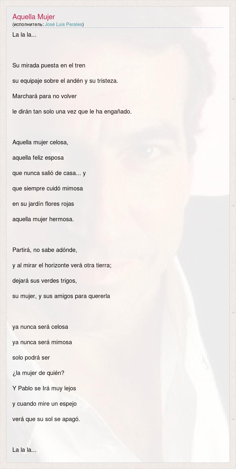 La la la... Su mirada puesta en el tren su equipaje sobre el andén y su tristeza. Marchará para no volver le dirán tan solo una vez que le ha engañado. Aquella mujer celosa, aquella feliz esposa que nunca salió de casa... y que siempre cuidó mimosa en su jardín flores rojas aquella mujer hermosa. Partirá, no sabe adónde, y al mirar el horizonte verá otra tierra; dejará sus verdes trigos, su mujer, y sus amigos para quererla ya nunca será celosa ya nunca será mimosa solo podrá ser ¿la mujer de quién? Y Pablo se Irá muy lejos y cuando mire un espejo verá que su sol se apagó. La la la...