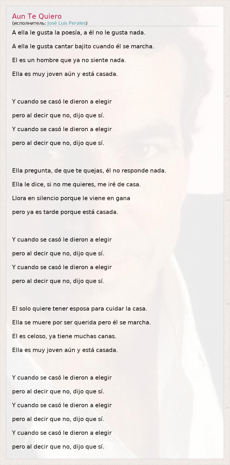 Это интересно:José Luis Perales José Luis Perales Birth name José Luis Perales Morillas Born 28 January 1945 (1945-01-28) (age 66)Castejón, Cuenca, Spain Genres BaladaRomantic music Occupations Musician, Songwriter Instruments Guitar, Vocals Years active 1972-present Labels Hispavox, Sony Music / BMG, Columbia Records Website http://www.joseluisperales.net/ (Spanish) José Luis Perales (born January 28, 1945 in Castejón, Cuenca Province) is a Spanish singer-songwriter and composer who is very popular in Spain and Latin America. He has performed some of his extensive work... продолжение