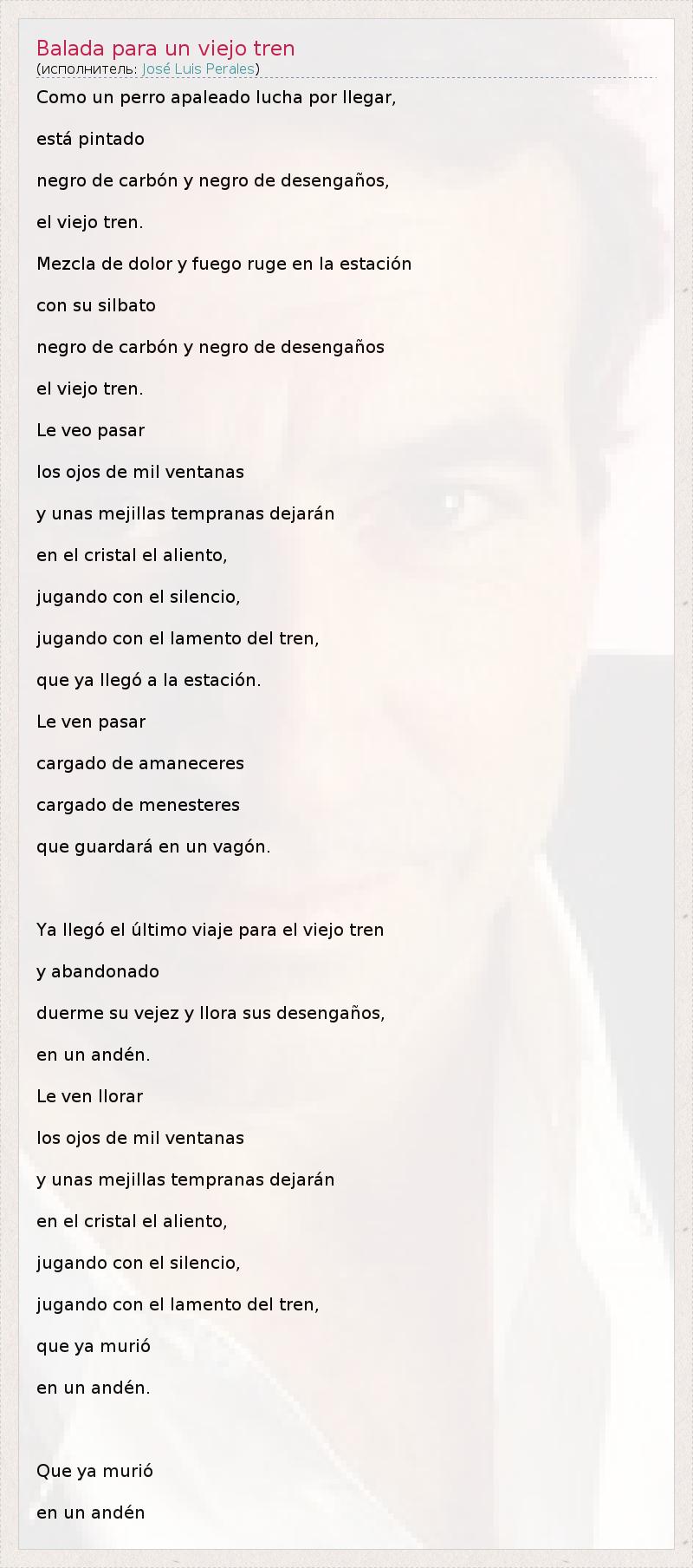 Como un perro apaleado lucha por llegar, está pintado negro de carbón y negro de desengaños, el viejo tren. Mezcla de dolor y fuego ruge en la estación con su silbato negro de carbón y negro de desengaños el viejo tren. Le veo pasar los ojos de mil ventanas y unas mejillas tempranas dejarán en el cristal el aliento, jugando con el silencio, jugando con el lamento del tren, que ya llegó a la estación. Le ven pasar cargado de amaneceres cargado de menesteres que guardará en un vagón. Ya llegó el último viaje para el viejo tren y abandonado duerme su vejez y llora sus desengaños, en un andén. Le ven llorar los ojos de mil ventanas y unas mejillas tempranas dejarán en el cristal el aliento, jugando con el silencio, jugando con el lamento del tren, que ya murió en un andén. Que ya murió en un andén