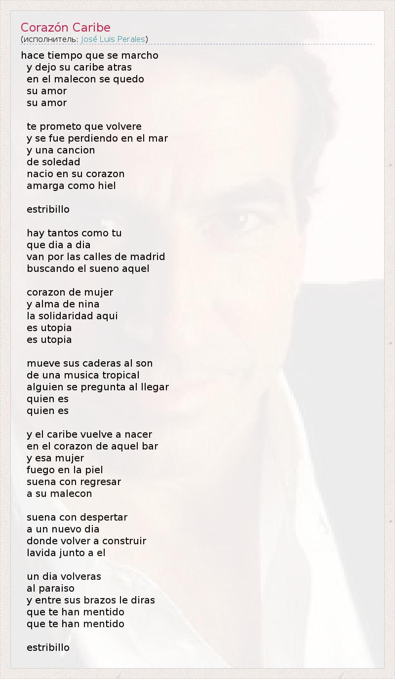 hace tiempo que se marcho y dejo su caribe atras en el malecon se quedo su amor su amor te prometo que volvere y se fue perdiendo en el mar y una cancion de soledad nacio en su corazon amarga como hiel estribillo hay tantos como tu que dia a dia van por las calles de madrid buscando el sueno aquel corazon de mujer y alma de nina la solidaridad aqui es utopia es utopia mueve sus caderas al son de una musica tropical alguien se pregunta al llegar quien es quien es y el caribe vuelve a nacer en el corazon de aquel bar y esa mujer fuego en la piel suena con regresar a su malecon suena con despertar a un nuevo dia donde volver a construir lavida junto a el un dia volveras al paraiso y entre sus brazos le diras que te han mentido que te han mentido estribillo