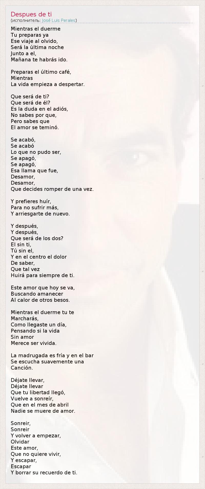 Mientras el duerme Tu preparas ya Ese viaje al olvido, Será la última noche Junto a el, Mañana te habrás ido. Preparas el último café, Mientras La vida empieza a despertar. Que será de ti? Que será de él? Es la duda en el adiós, No sabes por que, Pero sabes que El amor se teminó. Se acabó, Se acabó Lo que no pudo ser, Se apagó, Se apagó, Esa llama que fue, Desamor, Desamor, Que decides romper de una vez. Y prefieres huír, Para no sufrir más, Y arriesgarte de nuevo. Y después, Y después, Que será de los dos? El sin ti, Tú sin el, Y en el centro el dolor De saber, Que tal vez Huirá para siempre de ti. Este amor que hoy se va, Buscando amanecer Al calor de otros besos. Mientras el duerme tu te Marcharás, Como llegaste un día, Pensando si la vida Sin amor Merece ser vivida. La madrugada es fría y en el bar Se escucha suavemente una Canción. Déjate llevar, Déjate llevar Que tu libertad llegó, Vuelve a sonreír, Que en el mes de abril Nadie se muere de amor. Sonreir, Sonreir Y volver a empezar, Olvidar Este amor, Que no quiere vivir, Y escapar, Escapar Y borrar su recuerdo de ti.