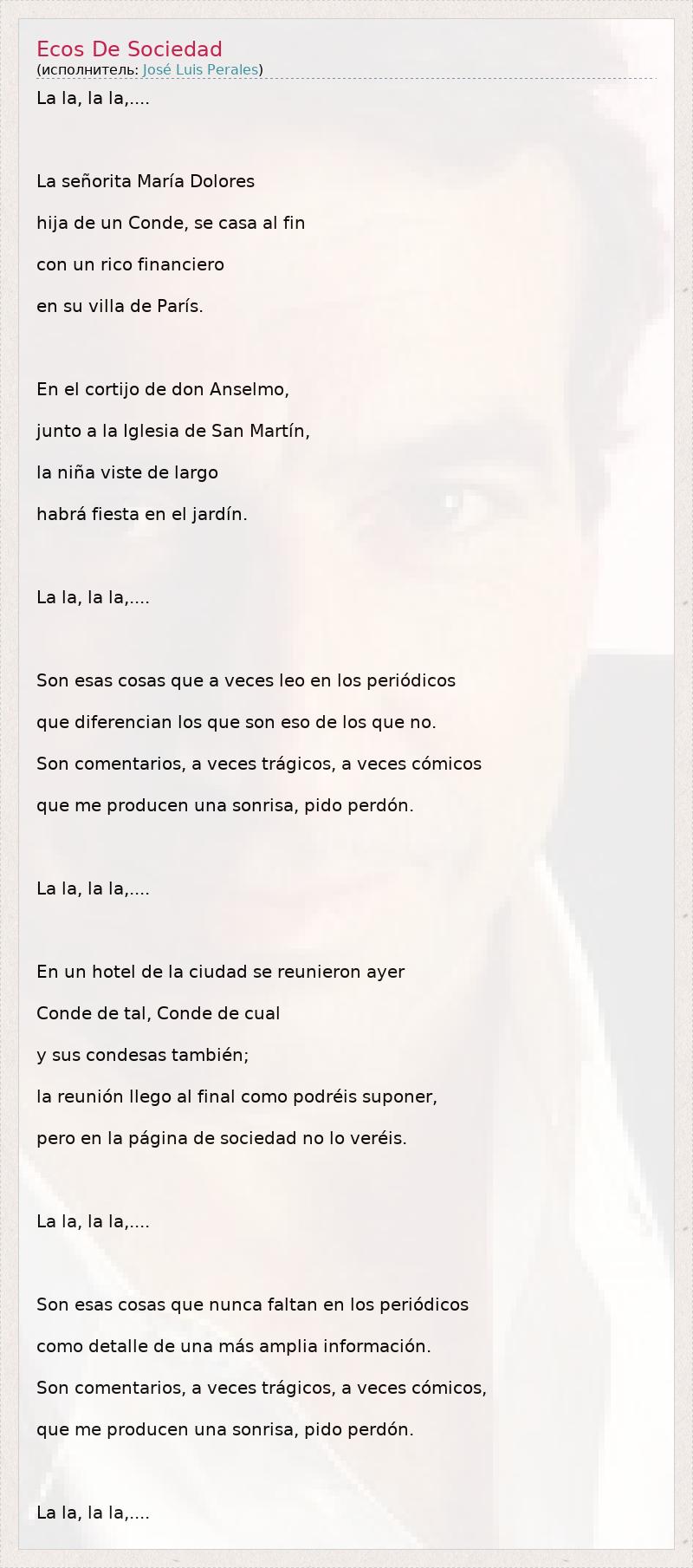La la, la la,.... La señorita María Dolores hija de un Conde, se casa al fin con un rico financiero en su villa de París. En el cortijo de don Anselmo, junto a la Iglesia de San Martín, la niña viste de largo habrá fiesta en el jardín. La la, la la,.... Son esas cosas que a veces leo en los periódicos que diferencian los que son eso de los que no. Son comentarios, a veces trágicos, a veces cómicos que me producen una sonrisa, pido perdón. La la, la la,.... En un hotel de la ciudad se reunieron ayer Conde de tal, Conde de cual y sus condesas también; la reunión llego al final como podréis suponer, pero en la página de sociedad no lo veréis. La la, la la,.... Son esas cosas que nunca faltan en los periódicos como detalle de una más amplia información. Son comentarios, a veces trágicos, a veces cómicos, que me producen una sonrisa, pido perdón. La la, la la,....