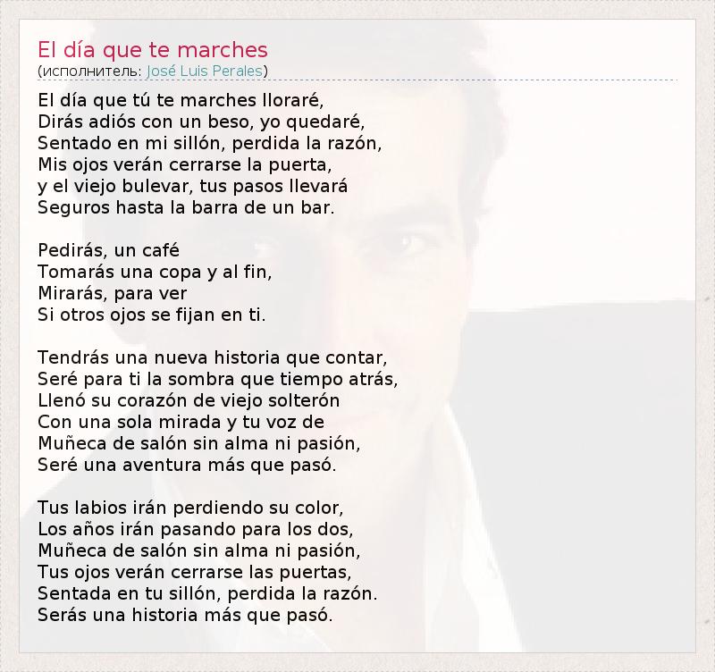 В день, когда ты уйдёшь, я буду плакать, Поцелуешь на прощание, а я останусь, Сидящим в своём кресле, теряя рассудок, Мои глаза увидят, как закрывается дверь, И старый бульвар унесёт твои Уверенные шаги до бара. Ты попросишь кофе, Выпьешь чашку и, наконец, Оглянешься, чтобы увидеть, Не устремлён ли чей-нибудь взгляд на тебя. У тебя будет новая история для рассказа, Я буду для тебя тенью прошлого С сердцем старого холостяка, наполненным Твоим взглядом и голосом Бездушной и безжизненной куклы, Я буду ещё одним приключением, которое закончилось. Твои губы потеряют свой цвет, Годы твои лучшие пройдут, Бездушная и безжизненная кукла, Твои глаза увидят закрывающиеся двери, Пока ты сидишь в своём кресле, теряя рассудок, Ты будешь ещё одной историей, которая закончилась.