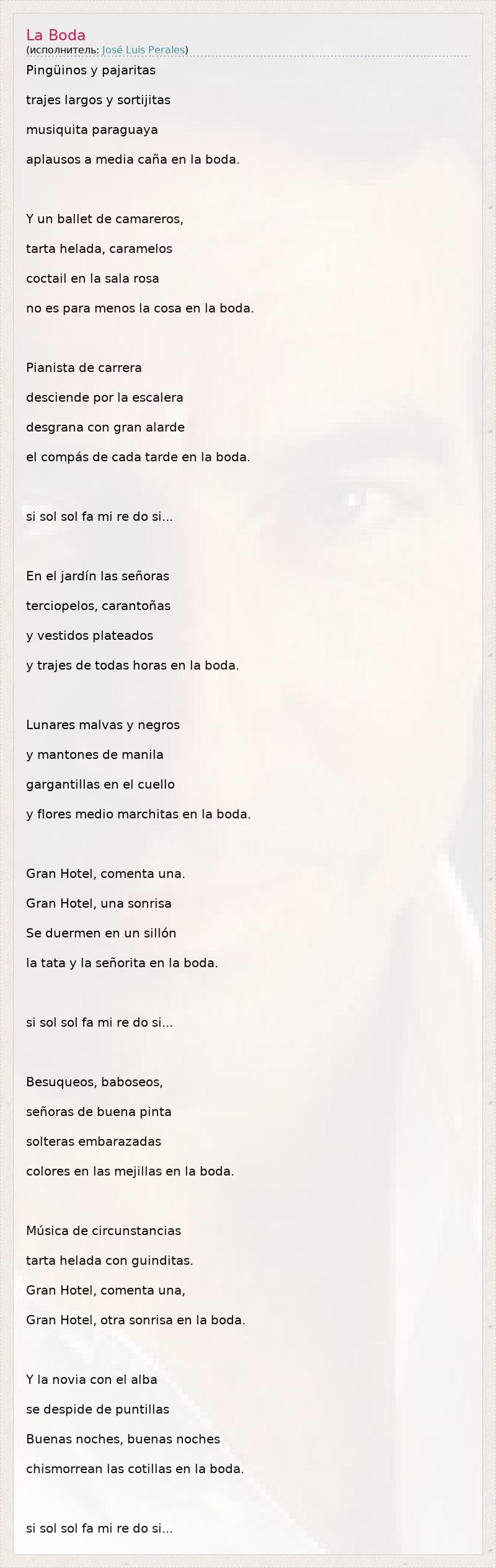 Pingüinos y pajaritas trajes largos y sortijitas musiquita paraguaya aplausos a media caña en la boda. Y un ballet de camareros, tarta helada, caramelos coctail en la sala rosa no es para menos la cosa en la boda. Pianista de carrera desciende por la escalera desgrana con gran alarde el compás de cada tarde en la boda. si sol sol fa mi re do si... En el jardín las señoras terciopelos, carantoñas y vestidos plateados y trajes de todas horas en la boda. Lunares malvas y negros y mantones de manila gargantillas en el cuello y flores medio marchitas en la boda. Gran Hotel, comenta una. Gran Hotel, una sonrisa Se duermen en un sillón la tata y la señorita en la boda. si sol sol fa mi re do si... Besuqueos, baboseos, señoras de buena pinta solteras embarazadas colores en las mejillas en la boda. Música de circunstancias tarta helada con guinditas. Gran Hotel, comenta una, Gran Hotel, otra sonrisa en la boda. Y la novia con el alba se despide de puntillas Buenas noches, buenas noches chismorrean las cotillas en la boda. si sol sol fa mi re do si...