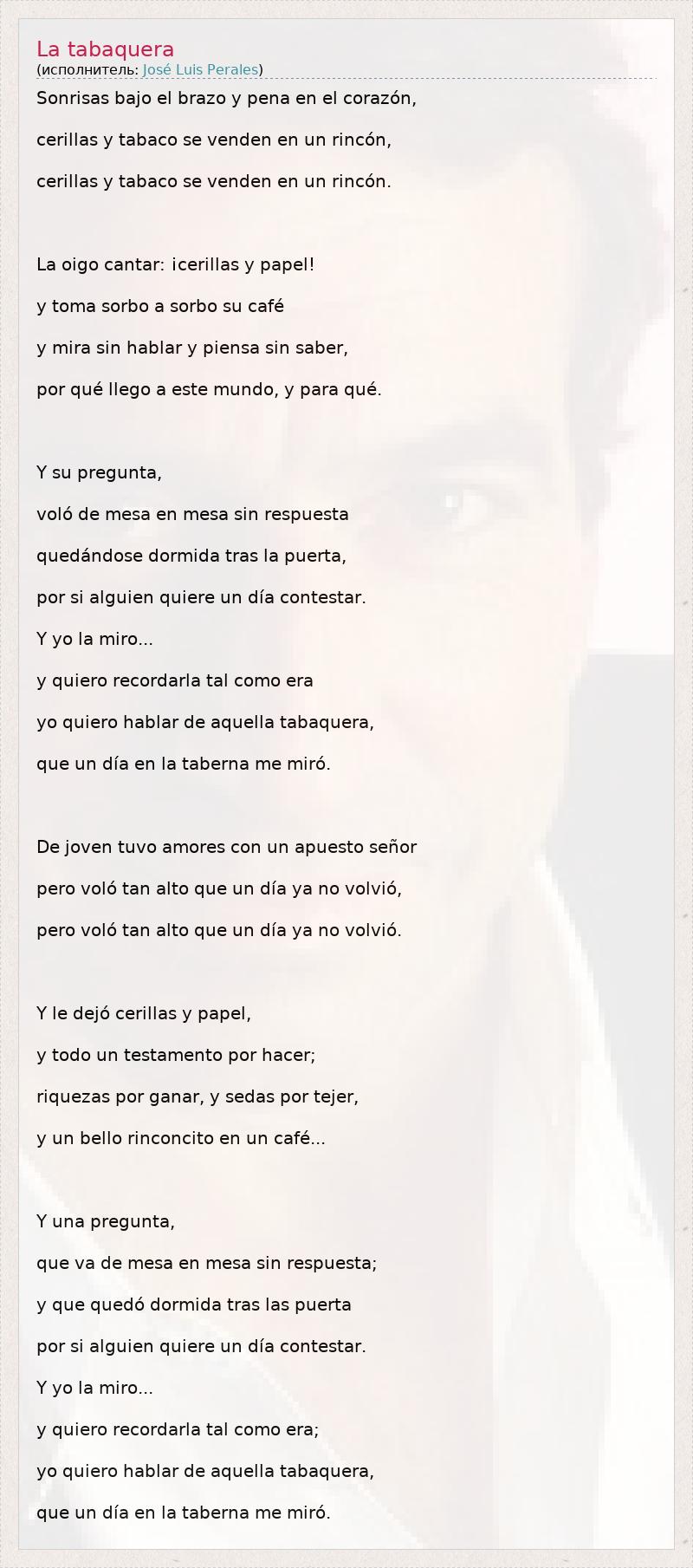 Sonrisas bajo el brazo y pena en el corazón, cerillas y tabaco se venden en un rincón, cerillas y tabaco se venden en un rincón. La oigo cantar: ¡cerillas y papel! y toma sorbo a sorbo su café y mira sin hablar y piensa sin saber, por qué llego a este mundo, y para qué. Y su pregunta, voló de mesa en mesa sin respuesta quedándose dormida tras la puerta, por si alguien quiere un día contestar. Y yo la miro... y quiero recordarla tal como era yo quiero hablar de aquella tabaquera, que un día en la taberna me miró. De joven tuvo amores con un apuesto señor pero voló tan alto que un día ya no volvió, pero voló tan alto que un día ya no volvió. Y le dejó cerillas y papel, y todo un testamento por hacer; riquezas por ganar, y sedas por tejer, y un bello rinconcito en un café... Y una pregunta, que va de mesa en mesa sin respuesta; y que quedó dormida tras las puerta por si alguien quiere un día contestar. Y yo la miro... y quiero recordarla tal como era; yo quiero hablar de aquella tabaquera, que un día en la taberna me miró.