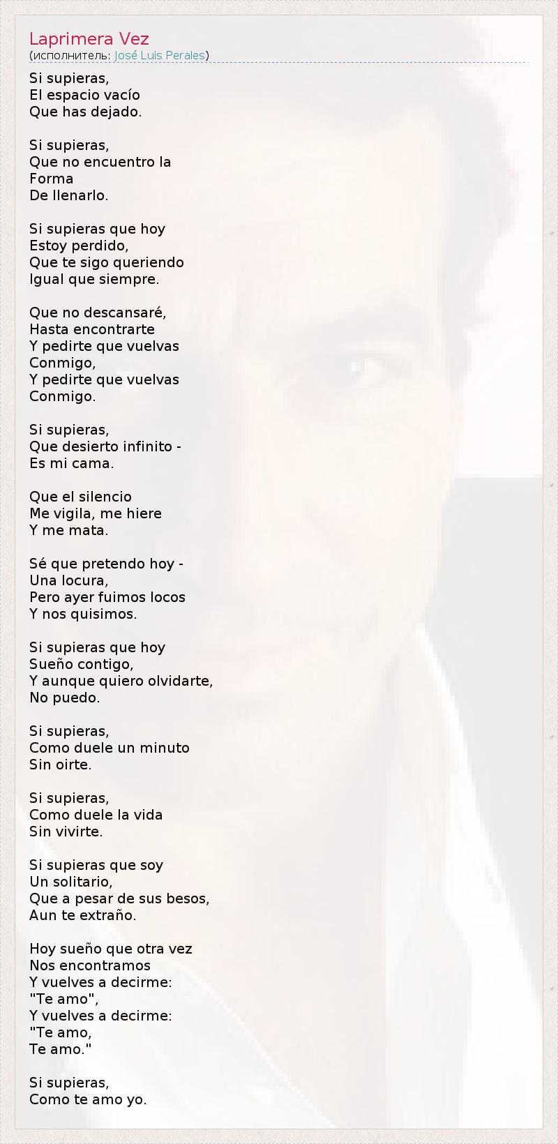 Это интересно:José Luis Perales José Luis Perales Birth name José Luis Perales Morillas Born 28 January 1945 (1945-01-28) (age 66)Castejón, Cuenca, Spain Genres BaladaRomantic music Occupations Musician, Songwriter Instruments Guitar, Vocals Years active 1972-present Labels Hispavox, Sony Music / BMG, Columbia Records Website http://www.joseluisperales.net/ (Spanish) José Luis Perales (born January 28, 1945 in Castejón, Cuenca Province) is a Spanish singer-songwriter and composer who is very popular in Spain and Latin America. He has performed some of his extensive work... продолжение
