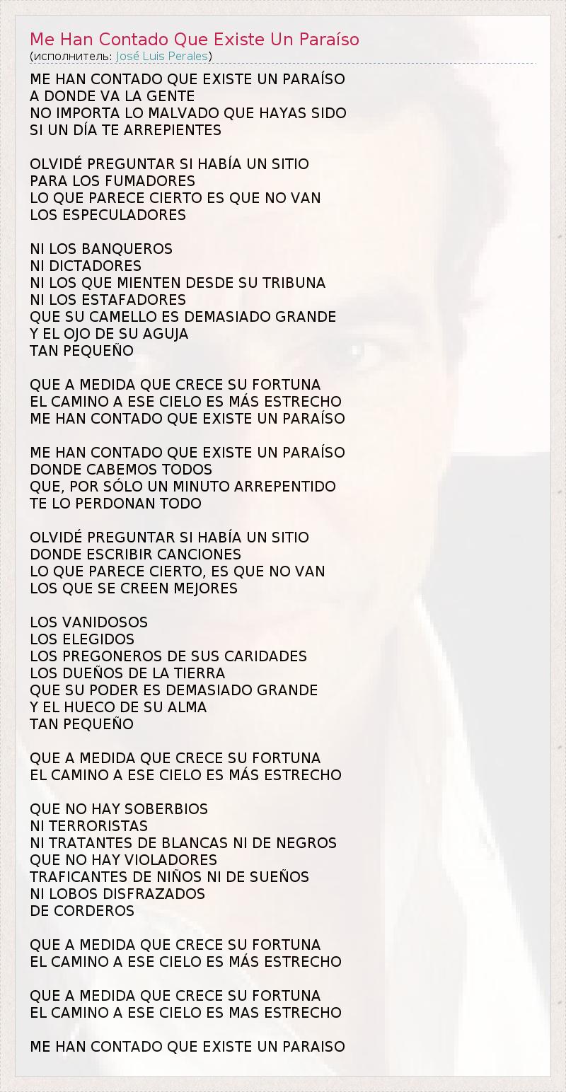 ME HAN CONTADO QUE EXISTE UN PARAÍSO A DONDE VA LA GENTE NO IMPORTA LO MALVADO QUE HAYAS SIDO SI UN DÍA TE ARREPIENTES OLVIDÉ PREGUNTAR SI HABÍA UN SITIO PARA LOS FUMADORES LO QUE PARECE CIERTO ES QUE NO VAN LOS ESPECULADORES NI LOS BANQUEROS NI DICTADORES NI LOS QUE MIENTEN DESDE SU TRIBUNA NI LOS ESTAFADORES QUE SU CAMELLO ES DEMASIADO GRANDE Y EL OJO DE SU AGUJA TAN PEQUEÑO QUE A MEDIDA QUE CRECE SU FORTUNA EL CAMINO A ESE CIELO ES MÁS ESTRECHO ME HAN CONTADO QUE EXISTE UN PARAÍSO ME HAN CONTADO QUE EXISTE UN PARAÍSO DONDE CABEMOS TODOS QUE, POR SÓLO UN MINUTO ARREPENTIDO TE LO PERDONAN TODO OLVIDÉ PREGUNTAR SI HABÍA UN SITIO DONDE ESCRIBIR CANCIONES LO QUE PARECE CIERTO, ES QUE NO VAN LOS QUE SE CREEN MEJORES LOS VANIDOSOS LOS ELEGIDOS LOS PREGONEROS DE SUS CARIDADES LOS DUEÑOS DE LA TIERRA QUE SU PODER ES DEMASIADO GRANDE Y EL HUECO DE SU ALMA TAN PEQUEÑO QUE A MEDIDA QUE CRECE SU FORTUNA EL CAMINO A ESE CIELO ES MÁS ESTRECHO QUE NO HAY SOBERBIOS NI TERRORISTAS NI TRATANTES DE BLANCAS NI DE NEGROS QUE NO HAY VIOLADORES TRAFICANTES DE NIÑOS NI DE SUEÑOS NI LOBOS DISFRAZADOS DE CORDEROS QUE A MEDIDA QUE CRECE SU FORTUNA EL CAMINO A ESE CIELO ES MÁS ESTRECHO QUE A MEDIDA QUE CRECE SU FORTUNA EL CAMINO A ESE CIELO ES MAS ESTRECHO ME HAN CONTADO QUE EXISTE UN PARAISO