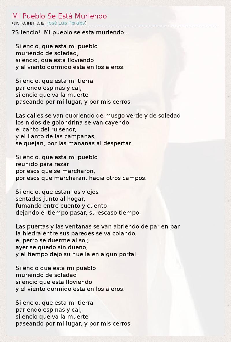 ?Silencio! Mi pueblo se esta muriendo... Silencio, que esta mi pueblo muriendo de soledad, silencio, que esta lloviendo y el viento dormido esta en los aleros. Silencio, que esta mi tierra pariendo espinas y cal, silencio que va la muerte paseando por mi lugar, y por mis cerros. Las calles se van cubriendo de musgo verde y de soledad los nidos de golondrina se van cayendo el canto del ruisenor, y el llanto de las campanas, se quejan, por las mananas al despertar. Silencio, que esta mi pueblo reunido para rezar por esos que se marcharon, por esos que marcharan, hacia otros campos. Silencio, que estan los viejos sentados junto al hogar, fumando entre cuento y cuento dejando el tiempo pasar, su escaso tiempo. Las puertas y las ventanas se van abriendo de par en par la hiedra entre sus paredes se va colando, el perro se duerme al sol; ayer se quedo sin dueno, y el tiempo dejo su huella en algun portal. Silencio que esta mi pueblo muriendo de soledad silencio que esta lloviendo y el viento dormido esta en los aleros. Silencio, que esta mi tierra pariendo espinas y cal, silencio que va la muerte paseando por mi lugar, y por mis cerros.