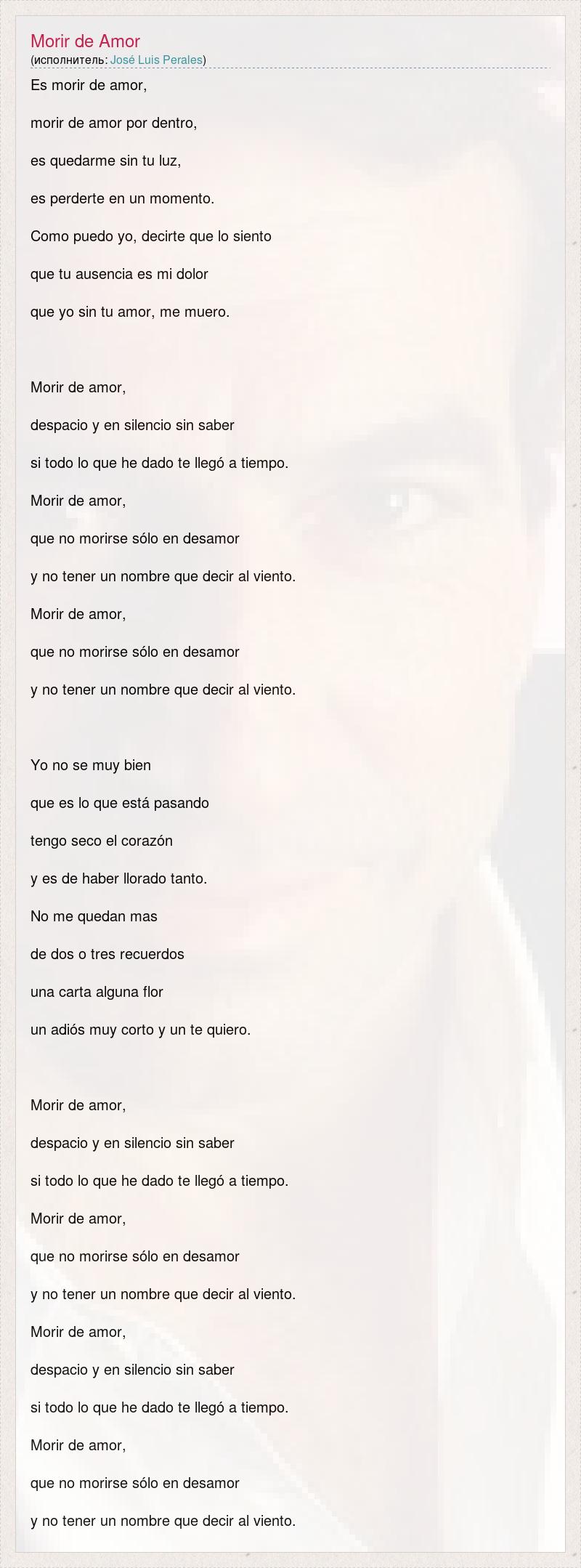 Es morir de amor, morir de amor por dentro, es quedarme sin tu luz, es perderte en un momento. Como puedo yo, decirte que lo siento que tu ausencia es mi dolor que yo sin tu amor, me muero. Morir de amor, despacio y en silencio sin saber si todo lo que he dado te llegó a tiempo. Morir de amor, que no morirse sólo en desamor y no tener un nombre que decir al viento. Morir de amor, que no morirse sólo en desamor y no tener un nombre que decir al viento. Yo no se muy bien que es lo que está pasando tengo seco el corazón y es de haber llorado tanto. No me quedan mas de dos o tres recuerdos una carta alguna flor un adiós muy corto y un te quiero. Morir de amor, despacio y en silencio sin saber si todo lo que he dado te llegó a tiempo. Morir de amor, que no morirse sólo en desamor y no tener un nombre que decir al viento. Morir de amor, despacio y en silencio sin saber si todo lo que he dado te llegó a tiempo. Morir de amor, que no morirse sólo en desamor y no tener un nombre que decir al viento.