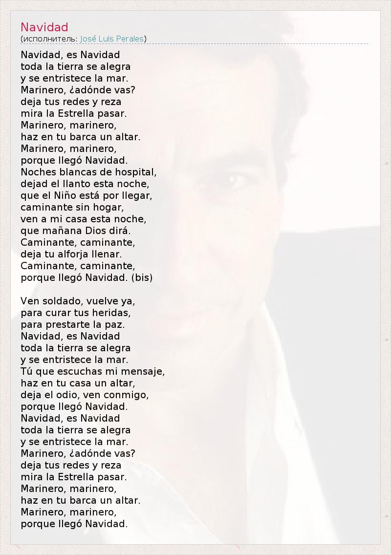 Navidad, es Navidad toda la tierra se alegra y se entristece la mar. Marinero, ¿adónde vas? deja tus redes y reza mira la Estrella pasar. Marinero, marinero, haz en tu barca un altar. Marinero, marinero, porque llegó Navidad. Noches blancas de hospital, dejad el llanto esta noche, que el Niño está por llegar, caminante sin hogar, ven a mi casa esta noche, que mañana Dios dirá. Caminante, caminante, deja tu alforja llenar. Caminante, caminante, porque llegó Navidad. (bis) Ven soldado, vuelve ya, para curar tus heridas, para prestarte la paz. Navidad, es Navidad toda la tierra se alegra y se entristece la mar. Tú que escuchas mi mensaje, haz en tu casa un altar, deja el odio, ven conmigo, porque llegó Navidad. Navidad, es Navidad toda la tierra se alegra y se entristece la mar. Marinero, ¿adónde vas? deja tus redes y reza mira la Estrella pasar. Marinero, marinero, haz en tu barca un altar. Marinero, marinero, porque llegó Navidad.