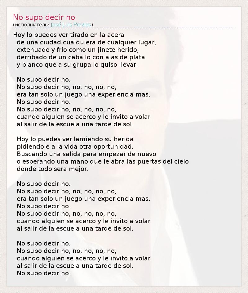 Hoy lo puedes ver tirado en la acera de una ciudad cualquiera de cualquier lugar, extenuado y frio como un jinete herido, derribado de un caballo con alas de plata y blanco que a su grupa lo quiso llevar. No supo decir no. No supo decir no, no, no, no, no, era tan solo un juego una experiencia mas. No supo decir no. No supo decir no, no, no, no, no, cuando alguien se acerco y le invito a volar al salir de la escuela una tarde de sol. Hoy lo puedes ver lamiendo su herida pidiendole a la vida otra oportunidad. Buscando una salida para empezar de nuevo o esperando una mano que le abra las puertas del cielo donde todo sera mejor. No supo decir no. No supo decir no, no, no, no, no, era tan solo un juego una experiencia mas. No supo decir no. No supo decir no, no, no, no, no, cuando alguien se acerco y le invito a volar al salir de la escuela una tarde de sol. No supo decir no. No supo decir no, no, no, no, no, cuando alguien se acerco y le invito a volar al salir de la escuela una tarde de sol. No supo decir no.
