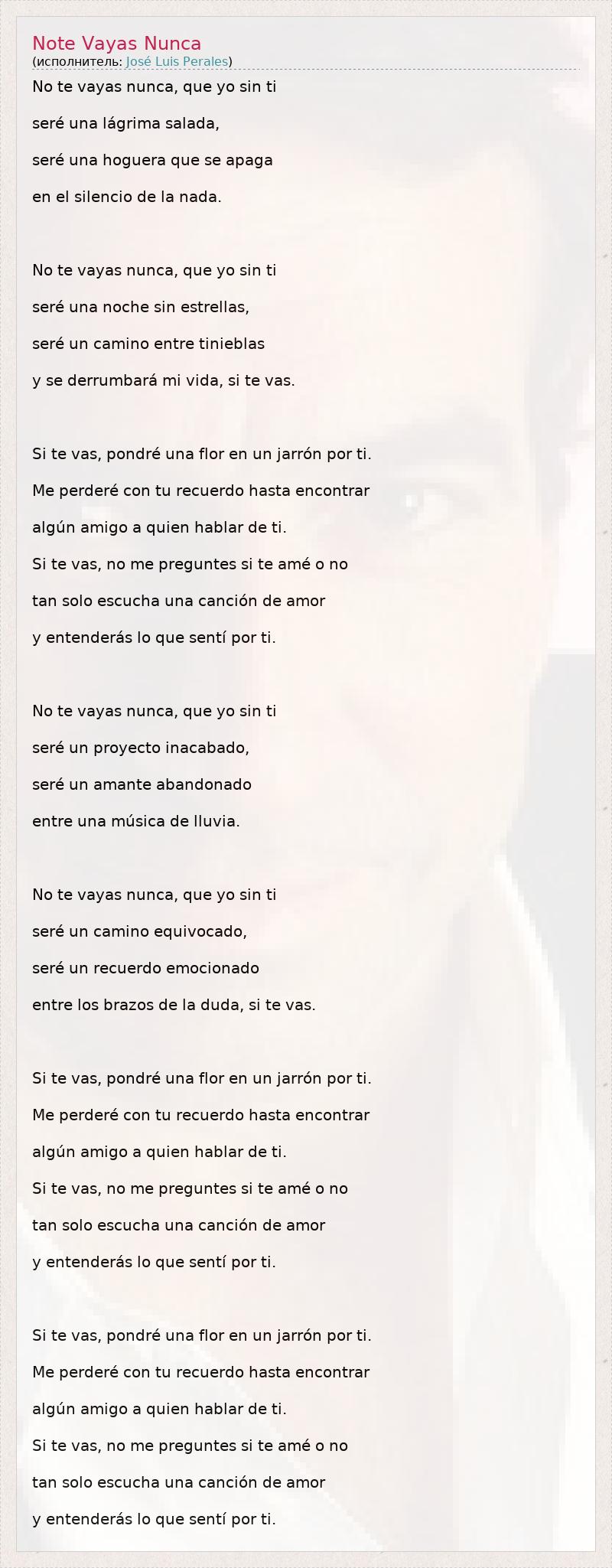 No te vayas nunca, que yo sin ti seré una lágrima salada, seré una hoguera que se apaga en el silencio de la nada. No te vayas nunca, que yo sin ti seré una noche sin estrellas, seré un camino entre tinieblas y se derrumbará mi vida, si te vas. Si te vas, pondré una flor en un jarrón por ti. Me perderé con tu recuerdo hasta encontrar algún amigo a quien hablar de ti. Si te vas, no me preguntes si te amé o no tan solo escucha una canción de amor y entenderás lo que sentí por ti. No te vayas nunca, que yo sin ti seré un proyecto inacabado, seré un amante abandonado entre una música de lluvia. No te vayas nunca, que yo sin ti seré un camino equivocado, seré un recuerdo emocionado entre los brazos de la duda, si te vas. Si te vas, pondré una flor en un jarrón por ti. Me perderé con tu recuerdo hasta encontrar algún amigo a quien hablar de ti. Si te vas, no me preguntes si te amé o no tan solo escucha una canción de amor y entenderás lo que sentí por ti. Si te vas, pondré una flor en un jarrón por ti. Me perderé con tu recuerdo hasta encontrar algún amigo a quien hablar de ti. Si te vas, no me preguntes si te amé o no tan solo escucha una canción de amor y entenderás lo que sentí por ti.
