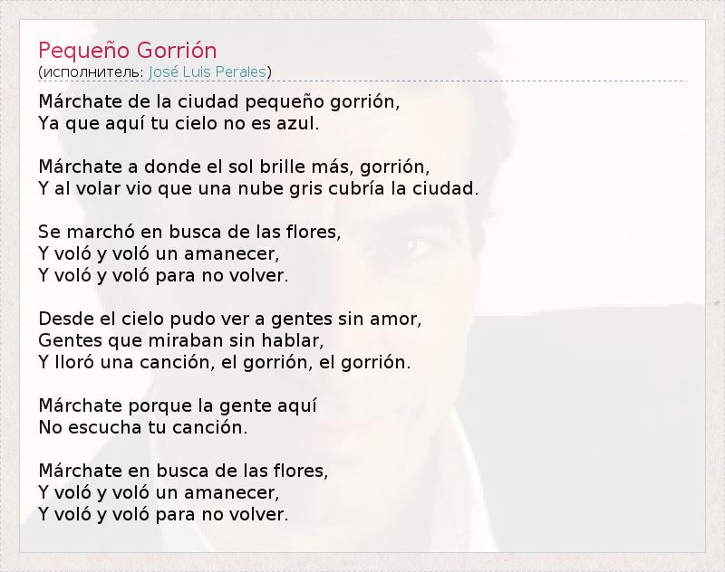 Márchate de la ciudad pequeño gorrión, Ya que aquí tu cielo no es azul. Márchate a donde el sol brille más, gorrión, Y al volar vio que una nube gris cubría la ciudad. Se marchó en busca de las flores, Y voló y voló un amanecer, Y voló y voló para no volver. Desde el cielo pudo ver a gentes sin amor, Gentes que miraban sin hablar, Y lloró una canción, el gorrión, el gorrión. Márchate porque la gente aquí No escucha tu canción. Márchate en busca de las flores, Y voló y voló un amanecer, Y voló y voló para no volver.