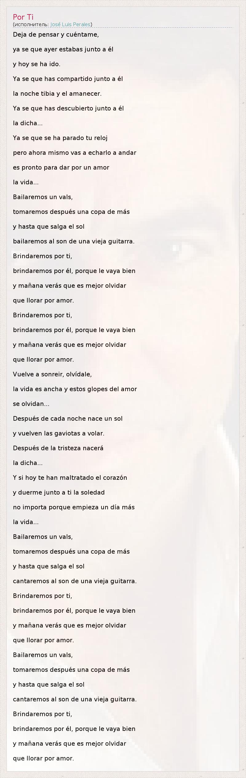 Это интересно:José Luis Perales José Luis Perales Birth name José Luis Perales Morillas Born 28 January 1945 (1945-01-28) (age 66)Castejón, Cuenca, Spain Genres BaladaRomantic music Occupations Musician, Songwriter Instruments Guitar, Vocals Years active 1972-present Labels Hispavox, Sony Music / BMG, Columbia Records Website http://www.joseluisperales.net/ (Spanish) José Luis Perales (born January 28, 1945 in Castejón, Cuenca Province) is a Spanish singer-songwriter and composer who is very popular in Spain and Latin America. He has performed some of his extensive work... продолжение