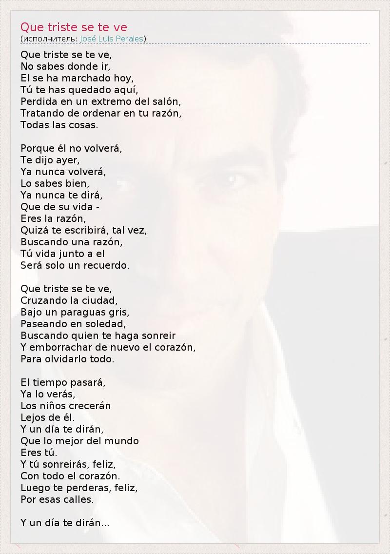 Que triste se te ve, No sabes donde ir, El se ha marchado hoy, Tú te has quedado aquí, Perdida en un extremo del salón, Tratando de ordenar en tu razón, Todas las cosas. Porque él no volverá, Te dijo ayer, Ya nunca volverá, Lo sabes bien, Ya nunca te dirá, Que de su vida - Eres la razón, Quizá te escribirá, tal vez, Buscando una razón, Tú vida junto a el Será solo un recuerdo. Que triste se te ve, Cruzando la ciudad, Bajo un paraguas gris, Paseando en soledad, Buscando quien te haga sonreir Y emborrachar de nuevo el corazón, Para olvidarlo todo. El tiempo pasará, Ya lo verás, Los niños crecerán Lejos de él. Y un día te dirán, Que lo mejor del mundo Eres tú. Y tú sonreirás, feliz, Con todo el corazón. Luego te perderas, feliz, Por esas calles. Y un día te dirán...