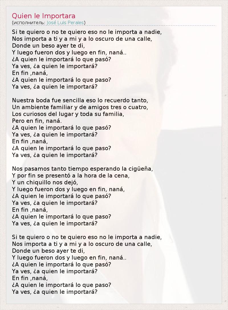 Si te quiero o no te quiero eso no le importa a nadie, Nos importa a ti y a mi y a lo oscuro de una calle, Donde un beso ayer te di, Y luego fueron dos y luego en fin, naná.. ¿A quien le importará lo que pasó? Ya ves, ¿a quien le importará? En fin ,naná, ¿A quien le importará lo que paso? Ya ves, ¿a quien le importará? Nuestra boda fue sencilla eso lo recuerdo tanto, Un ambiente familiar y de amigos tres o cuatro, Los curiosos del lugar y toda su familia, Pero en fin, naná. ¿A quien le importará lo que pasó? Ya ves, ¿a quien le importará? En fin ,naná, ¿A quien le importará lo que paso? Ya ves, ¿a quien le importará? Nos pasamos tanto tiempo esperando la cigüeña, Y por fin se presentó a la hora de la cena, Y un chiquillo nos dejó, Y luego fueron dos y luego en fin, naná, ¿A quien le importará lo que pasó? Ya ves, ¿a quien le importará? En fin ,naná, ¿A quien le importará lo que paso? Ya ves, ¿a quien le importará? Si te quiero o no te quiero eso no le importa a nadie, Nos importa a ti y a mi y a lo oscuro de una calle, Donde un beso ayer te di, Y luego fueron dos y luego en fin, naná.. ¿A quien le importará lo que pasó? Ya ves, ¿a quien le importará? En fin ,naná, ¿A quien le importará lo que paso? Ya ves, ¿a quien le importará?