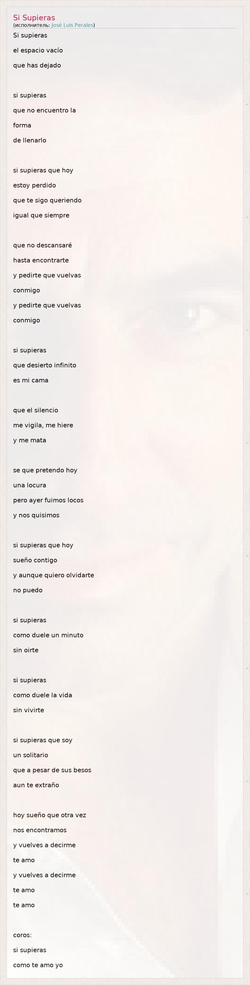Si supieras el espacio vacío que has dejado si supieras que no encuentro la forma de llenarlo si supieras que hoy estoy perdido que te sigo queriendo igual que siempre que no descansaré hasta encontrarte y pedirte que vuelvas conmigo y pedirte que vuelvas conmigo si supieras que desierto infinito es mi cama que el silencio me vigila, me hiere y me mata se que pretendo hoy una locura pero ayer fuimos locos y nos quisimos si supieras que hoy sueño contigo y aunque quiero olvidarte no puedo si supieras como duele un minuto sin oirte si supieras como duele la vida sin vivirte si supieras que soy un solitario que a pesar de sus besos aun te extraño hoy sueño que otra vez nos encontramos y vuelves a decirme te amo y vuelves a decirme te amo te amo coros: si supieras como te amo yo