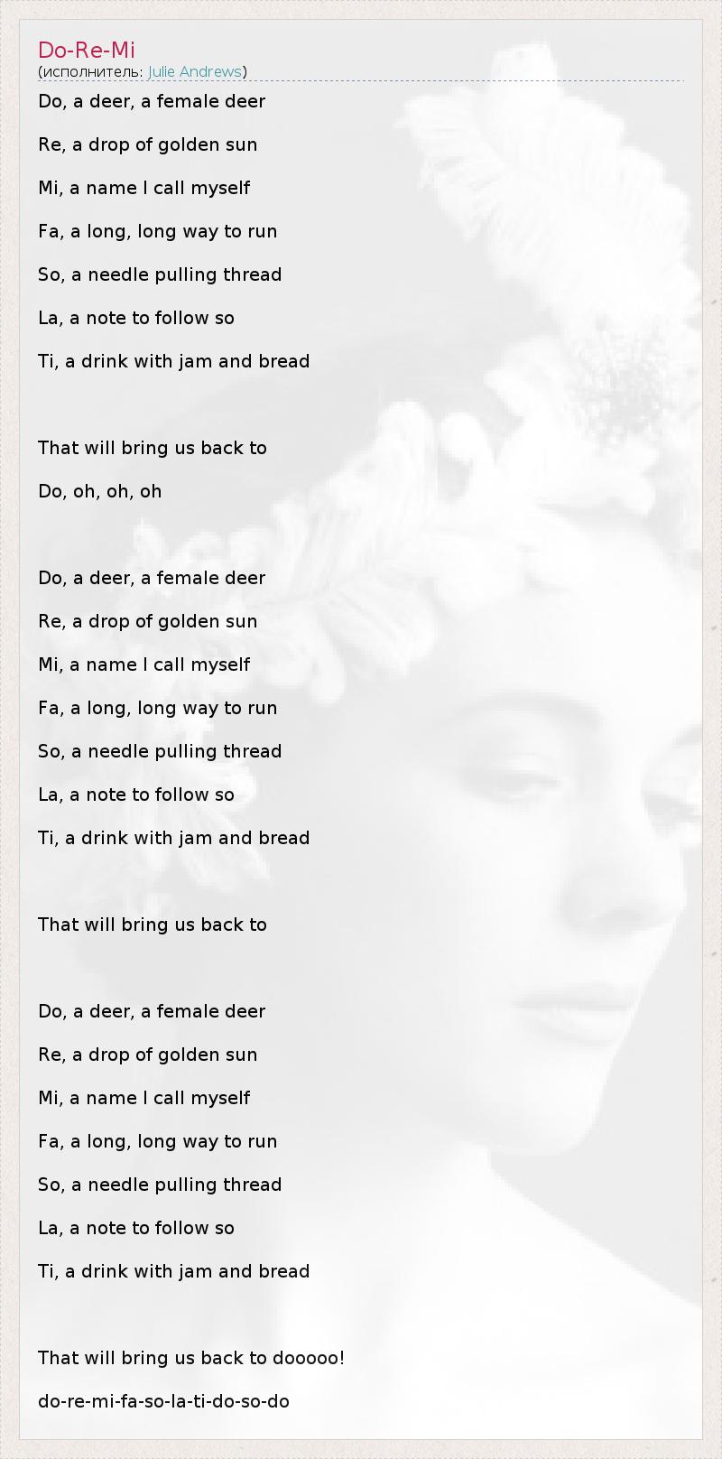 Do, a deer, a female deer Re, a drop of golden sun Mi, a name I call myself Fa, a long, long way to run So, a needle pulling thread La, a note to follow so Ti, a drink with jam and bread That will bring us back to Do, oh, oh, oh Do, a deer, a female deer Re, a drop of golden sun Mi, a name I call myself Fa, a long, long way to run So, a needle pulling thread La, a note to follow so Ti, a drink with jam and bread That will bring us back to Do, a deer, a female deer Re, a drop of golden sun Mi, a name I call myself Fa, a long, long way to run So, a needle pulling thread La, a note to follow so Ti, a drink with jam and bread That will bring us back to dooooo! do-re-mi-fa-so-la-ti-do-so-do