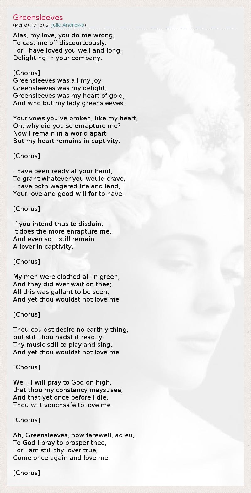 Alas, my love, you do me wrong, To cast me off discourteously. For I have loved you well and long, Delighting in your company. [Chorus] Greensleeves was all my joy Greensleeves was my delight, Greensleeves was my heart of gold, And who but my lady greensleeves. Your vows you've broken, like my heart, Oh, why did you so enrapture me? Now I remain in a world apart But my heart remains in captivity. [Chorus] I have been ready at your hand, To grant whatever you would crave, I have both wagered life and land, Your love and good-will for to have. [Chorus] If you intend thus to disdain, It does the more enrapture me, And even so, I still remain A lover in captivity. [Chorus] My men were clothed all in green, And they did ever wait on thee; All this was gallant to be seen, And yet thou wouldst not love me. [Chorus] Thou couldst desire no earthly thing, but still thou hadst it readily. Thy music still to play and sing; And yet thou wouldst not love me. [Chorus] Well, I will pray to God on high, that thou my constancy mayst see, And that yet once before I die, Thou wilt vouchsafe to love me. [Chorus] Ah, Greensleeves, now farewell, adieu, To God I pray to prosper thee, For I am still thy lover true, Come once again and love me. [Chorus]