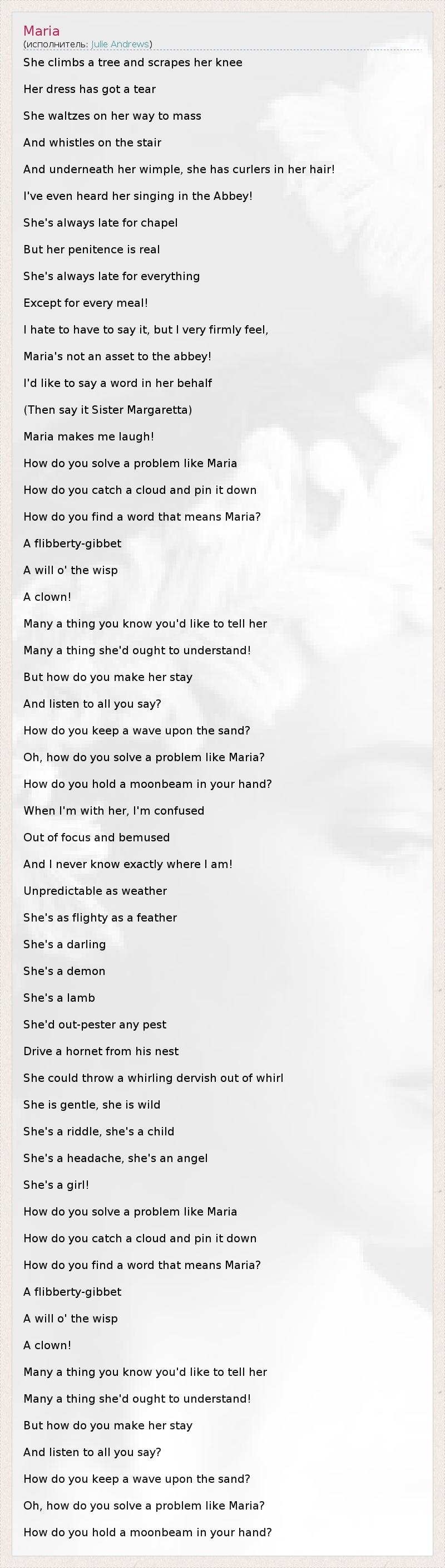 Это интересно:Джули Элизабет Эндрюс DBE (англ. Julie Elizabeth Andrews; р. 1 октября 1935) — английская актриса, певица и писательница. Обладательница премий «Эмми», «Грэмми», «Золотой глобус» и «Оскар».БиографияУже во время войны Эндрюс непрестанно выступала в мюзик-холлах Лондона, а с наступлением совершеннолетия перебралась на Бродвей, где её провозгласили королевой мюзикла. Настоящий фурор вызвало исполнение... продолжение