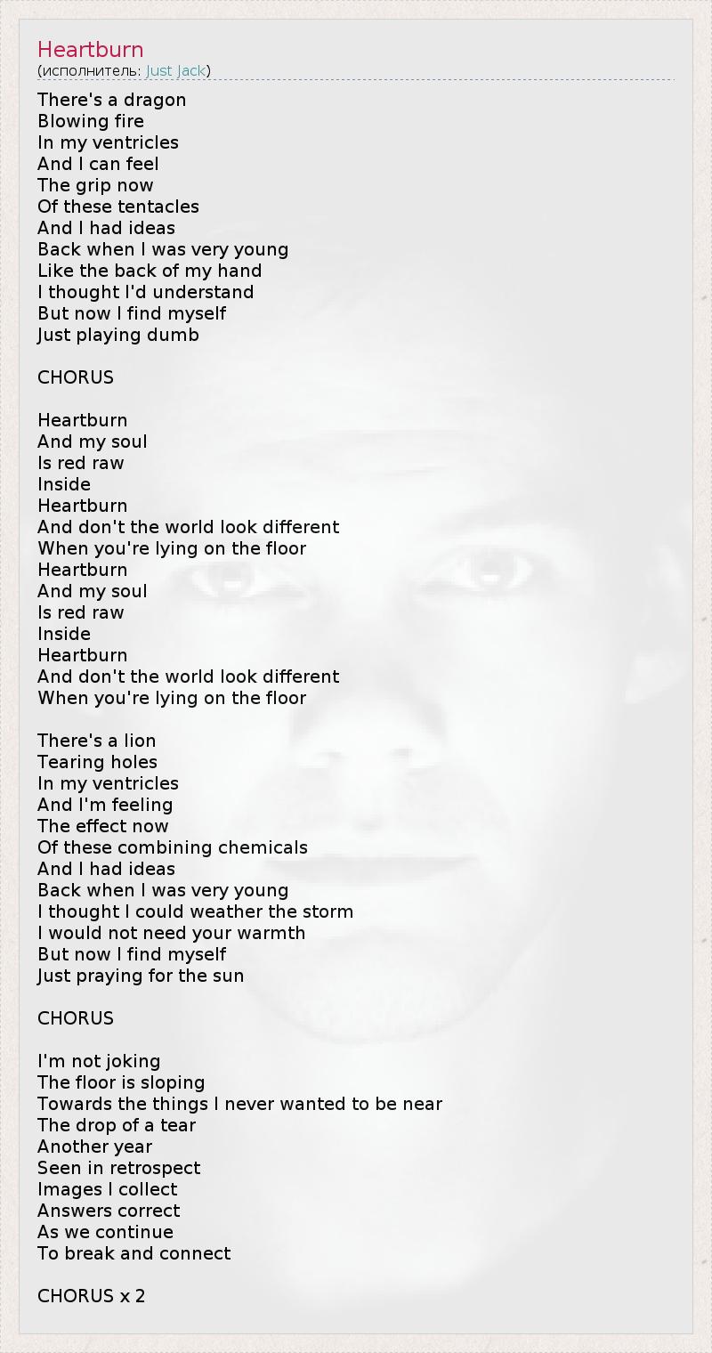 There's a dragon Blowing fire In my ventricles And I can feel The grip now Of these tentacles And I had ideas Back when I was very young Like the back of my hand I thought I'd understand But now I find myself Just playing dumb CHORUS Heartburn And my soul Is red raw Inside Heartburn And don't the world look different When you're lying on the floor Heartburn And my soul Is red raw Inside Heartburn And don't the world look different When you're lying on the floor There's a lion Tearing holes In my ventricles And I'm feeling The effect now Of these combining chemicals And I had ideas Back when I was very young I thought I could weather the storm I would not need your warmth But now I find myself Just praying for the sun CHORUS I'm not joking The floor is sloping Towards the things I never wanted to be near The drop of a tear Another year Seen in retrospect Images I collect Answers correct As we continue To break and connect CHORUS x 2