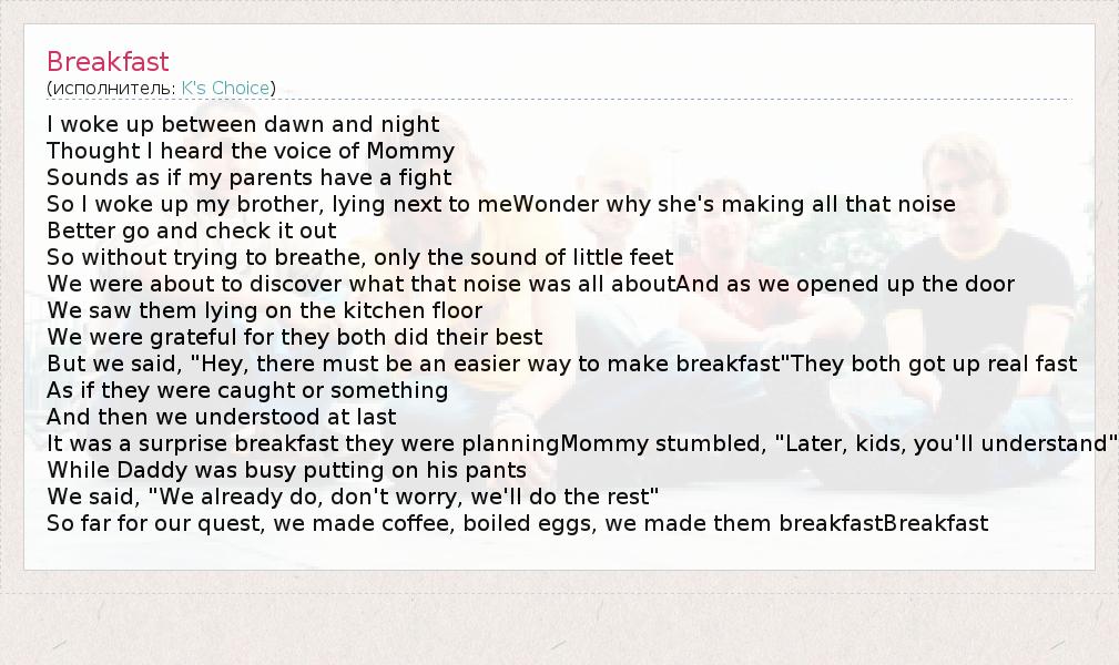 Это интересно:K’s Choice - бельгийская рок-группа из Антверпена. Их стиль можно охарактеризовать как гитарный рок, или фолк-рок.Состав:Сара Беттенс - вокал, гитара.Герт Беттенс - гитара, клавишные, вокал.Эрик Гроссман - бас-гитара.Ян ван Сихем младший - гитара.Коен Лиекенс - ударные.В настоящий момент участники группы работают над сольным проектами. Сара Беттенс выпустила альбом под... продолжение