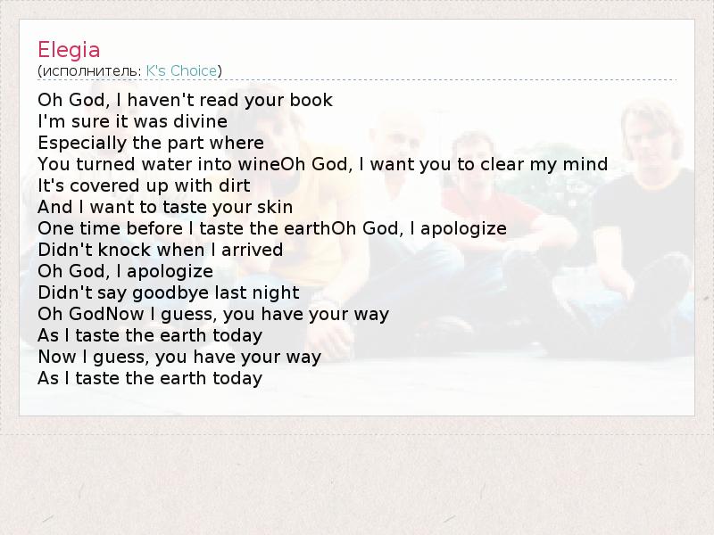 Это интересно:K’s Choice - бельгийская рок-группа из Антверпена. Их стиль можно охарактеризовать как гитарный рок, или фолк-рок.Состав:Сара Беттенс - вокал, гитара.Герт Беттенс - гитара, клавишные, вокал.Эрик Гроссман - бас-гитара.Ян ван Сихем младший - гитара.Коен Лиекенс - ударные.В настоящий момент участники группы работают над сольным проектами. Сара Беттенс выпустила альбом под... продолжение