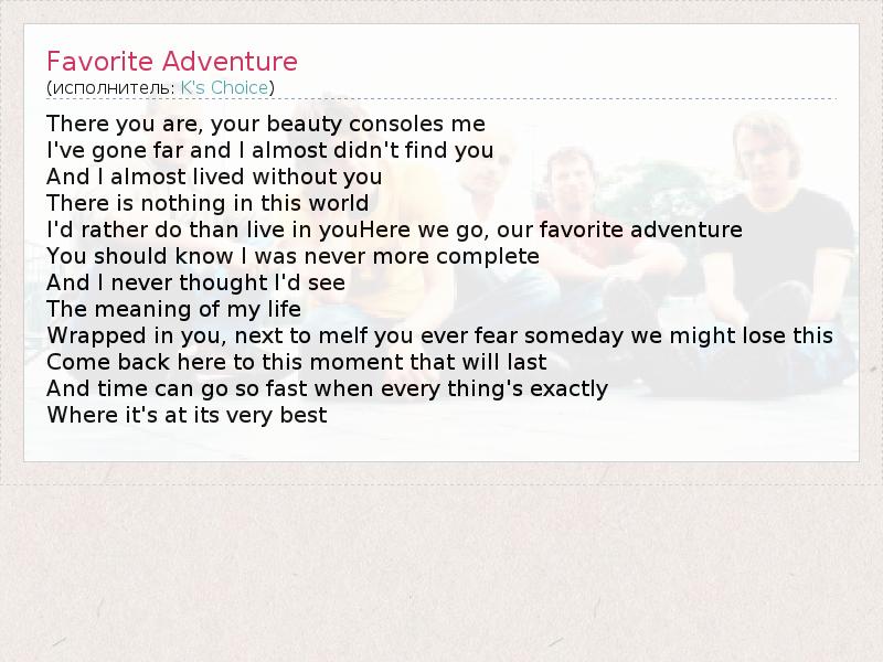 А как ты думаешь, о чем песня "Favorite Adventure" ?