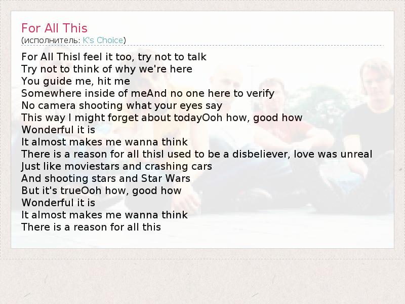 Это интересно:K’s Choice - бельгийская рок-группа из Антверпена. Их стиль можно охарактеризовать как гитарный рок, или фолк-рок.Состав:Сара Беттенс - вокал, гитара.Герт Беттенс - гитара, клавишные, вокал.Эрик Гроссман - бас-гитара.Ян ван Сихем младший - гитара.Коен Лиекенс - ударные.В настоящий момент участники группы работают над сольным проектами. Сара Беттенс выпустила альбом под... продолжение