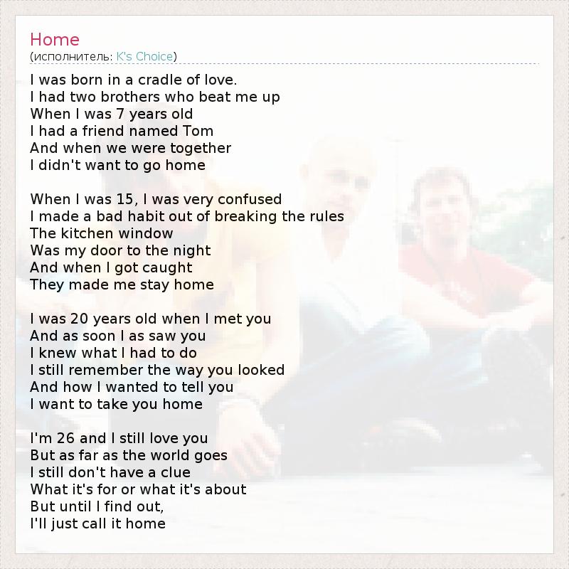 I was born in a cradle of love. I had two brothers who beat me up When I was 7 years old I had a friend named Tom And when we were together I didn't want to go home When I was 15, I was very confused I made a bad habit out of breaking the rules The kitchen window Was my door to the night And when I got caught They made me stay home I was 20 years old when I met you And as soon I as saw you I knew what I had to do I still remember the way you looked And how I wanted to tell you I want to take you home I'm 26 and I still love you But as far as the world goes I still don't have a clue What it's for or what it's about But until I find out, I'll just call it home